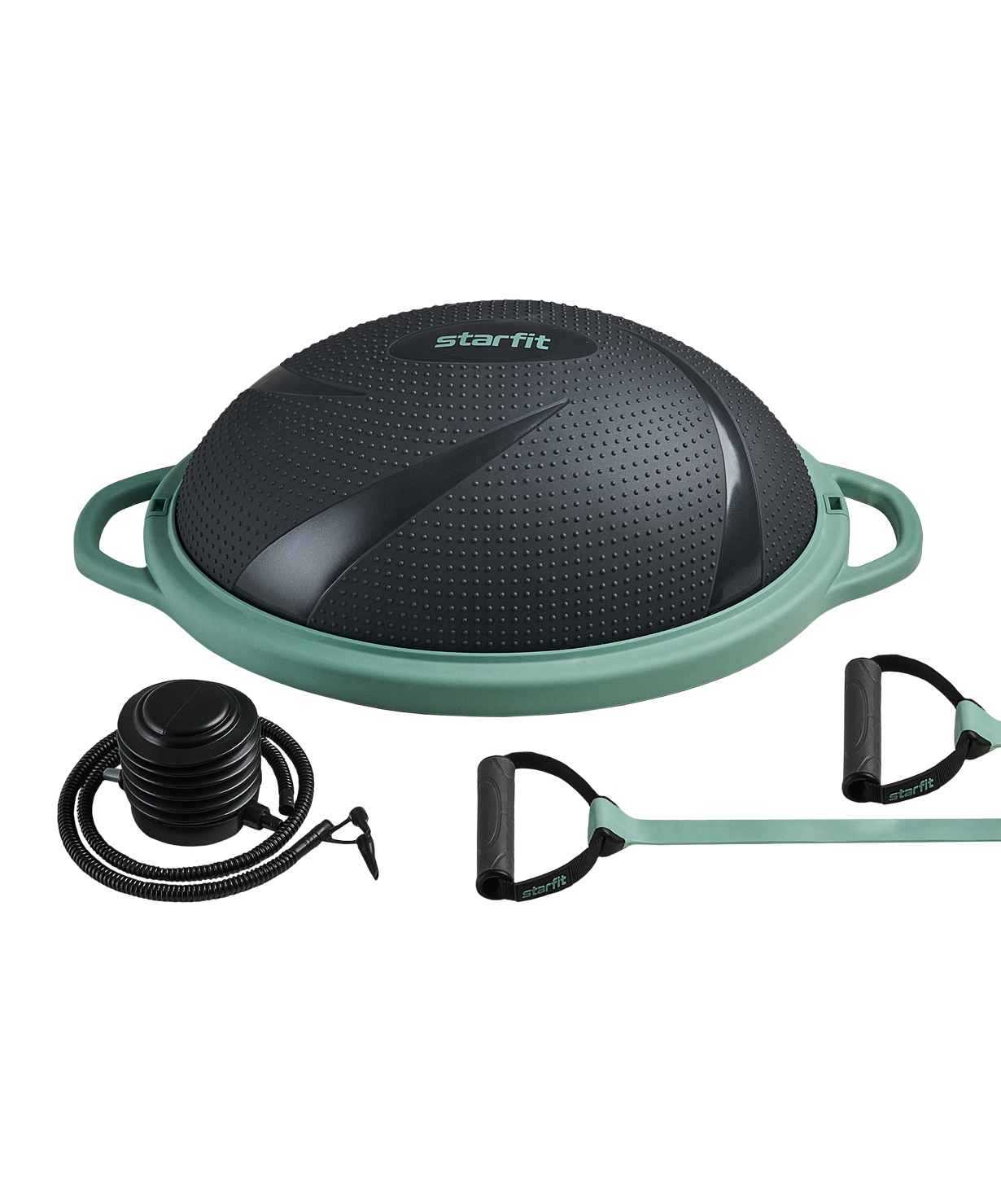 Полусфера «BOSU» GB-503 от Starfit – балансировочная платформа для тренировок в зале и дома, оснащенная съемными эспандерами. Тренажер отличается от аналогов своей оригинальной овальной формой. Увеличенная площадь позволяет разнообразить варианты упражнений опытным спортсменам и помогает удерживать равновесие новичкам, а противоскользящая поверхность делает тренировки безопаснее. Еще одно достоинство данной модели – устойчивое основание из прочного пластика. Платформа выдерживает нагрузку до 300 килограмм, ее можно использовать с обеих сторон, а удобные ручки упрощают транспортировку изделия.
