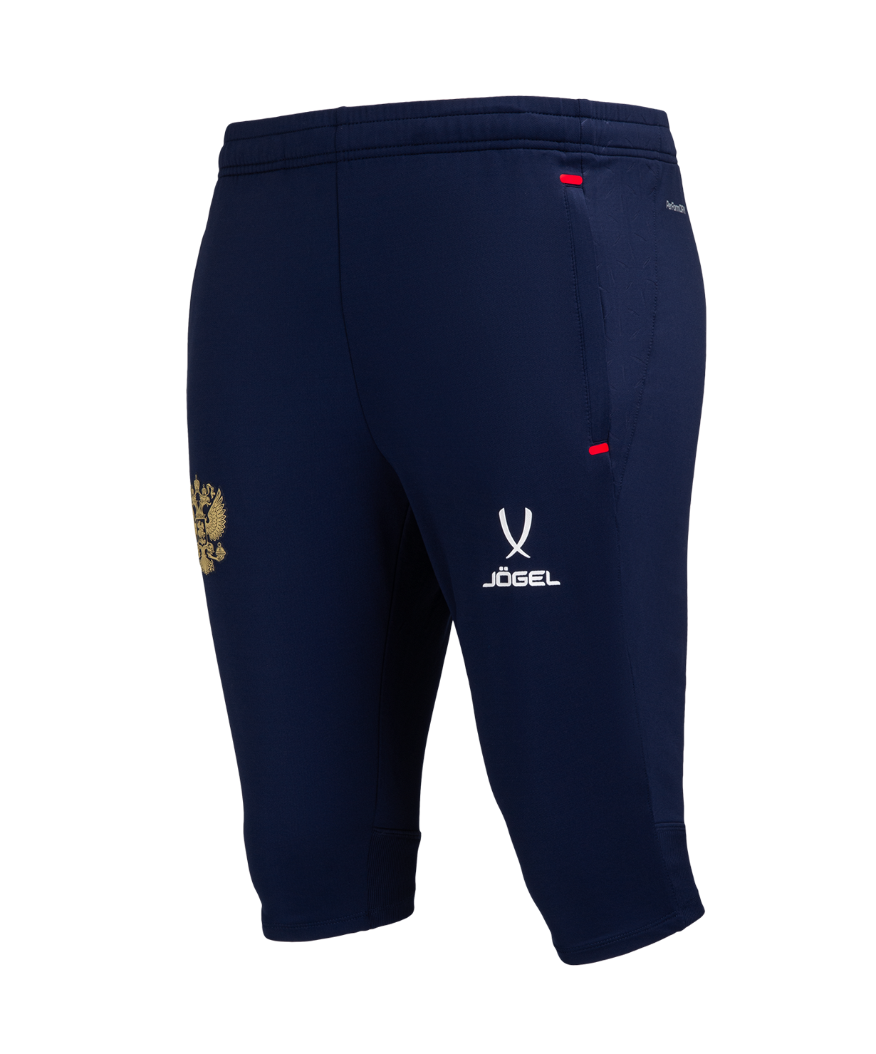 Укороченные тренировочные брюки 3/4 из легкого эластичного материала (93% полиэстер, 7% спандекс) с применением технологии эффективного влагоотведения PerFormDRY. Приятный на ощупь материал быстро отводит влагу и высыхает, обеспечивая комфорт даже при самых интенсивных тренировках. Ткань хорошо сохраняет форму даже при длительном использовании, не деформируется, сохраняет цвет. Зауженый силуэт с более свободной верхней частью брюк, атлетичный крой. Эластичный пояс регулируется стяжкой. Боковые карманы на молниях. Вставки из плотного эластичного материала в области коленей. Тиснение с дизайном РФС на боковых вставках, контрастные детали делают эту модель уникальной и эффектной.