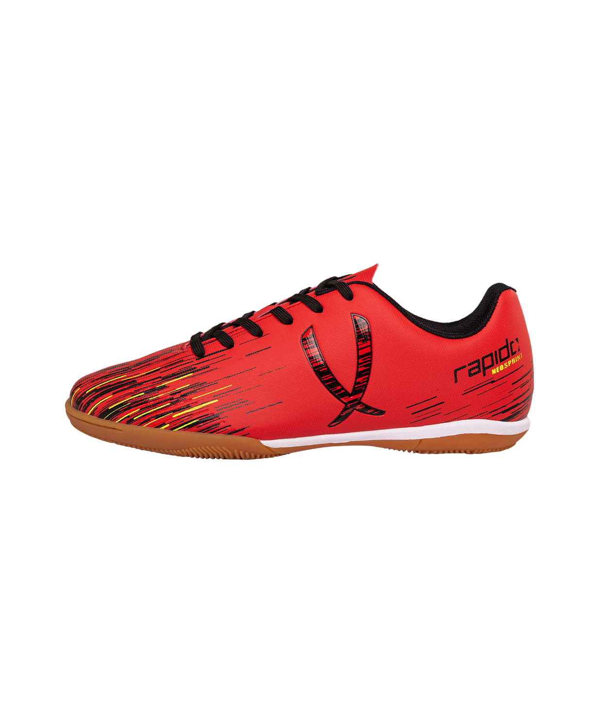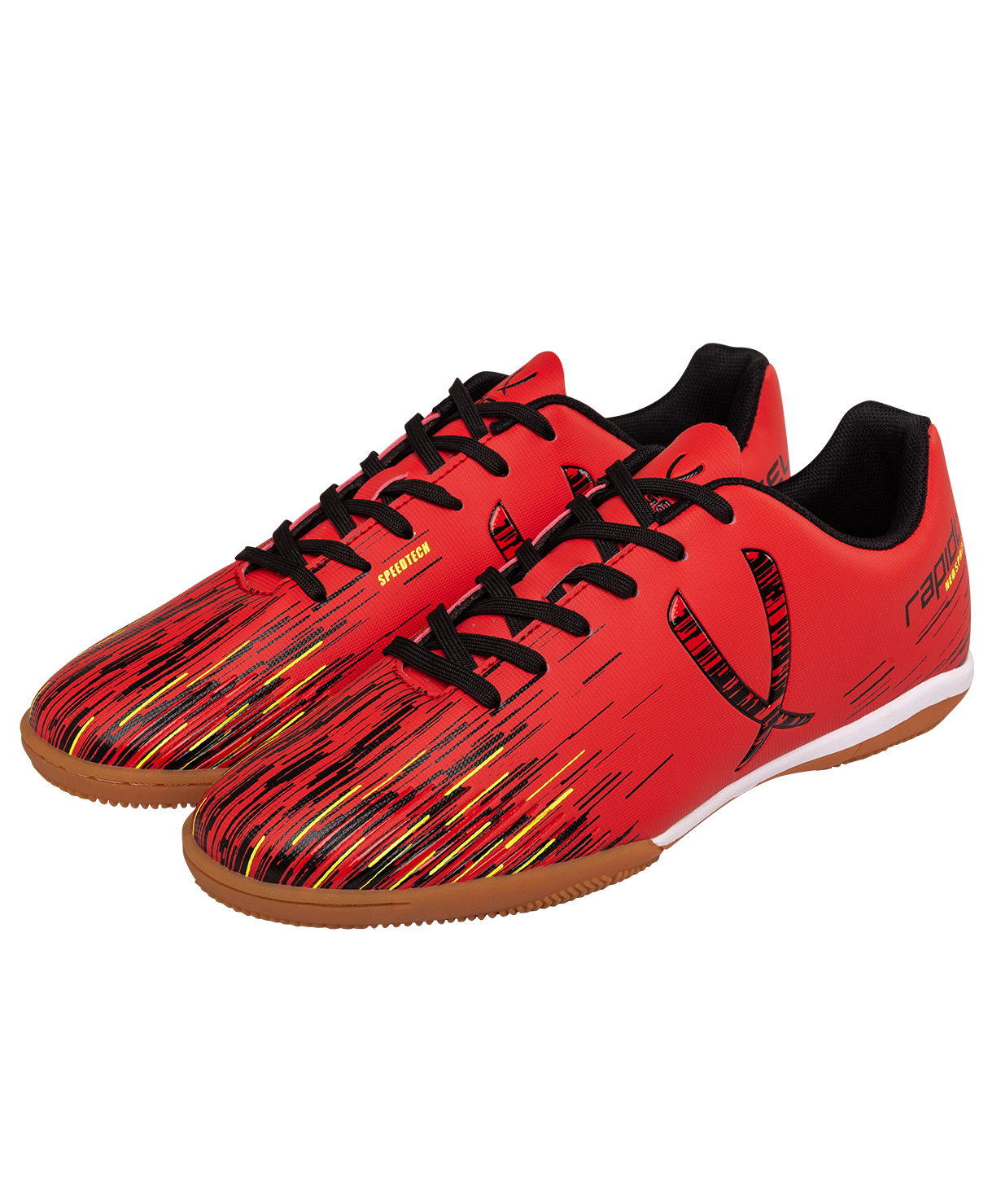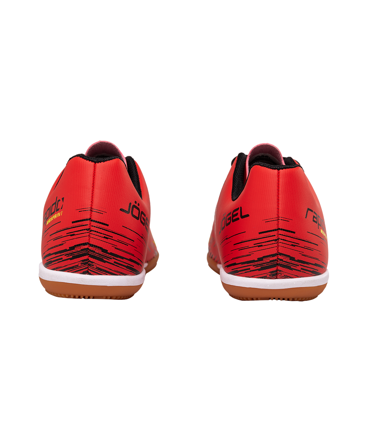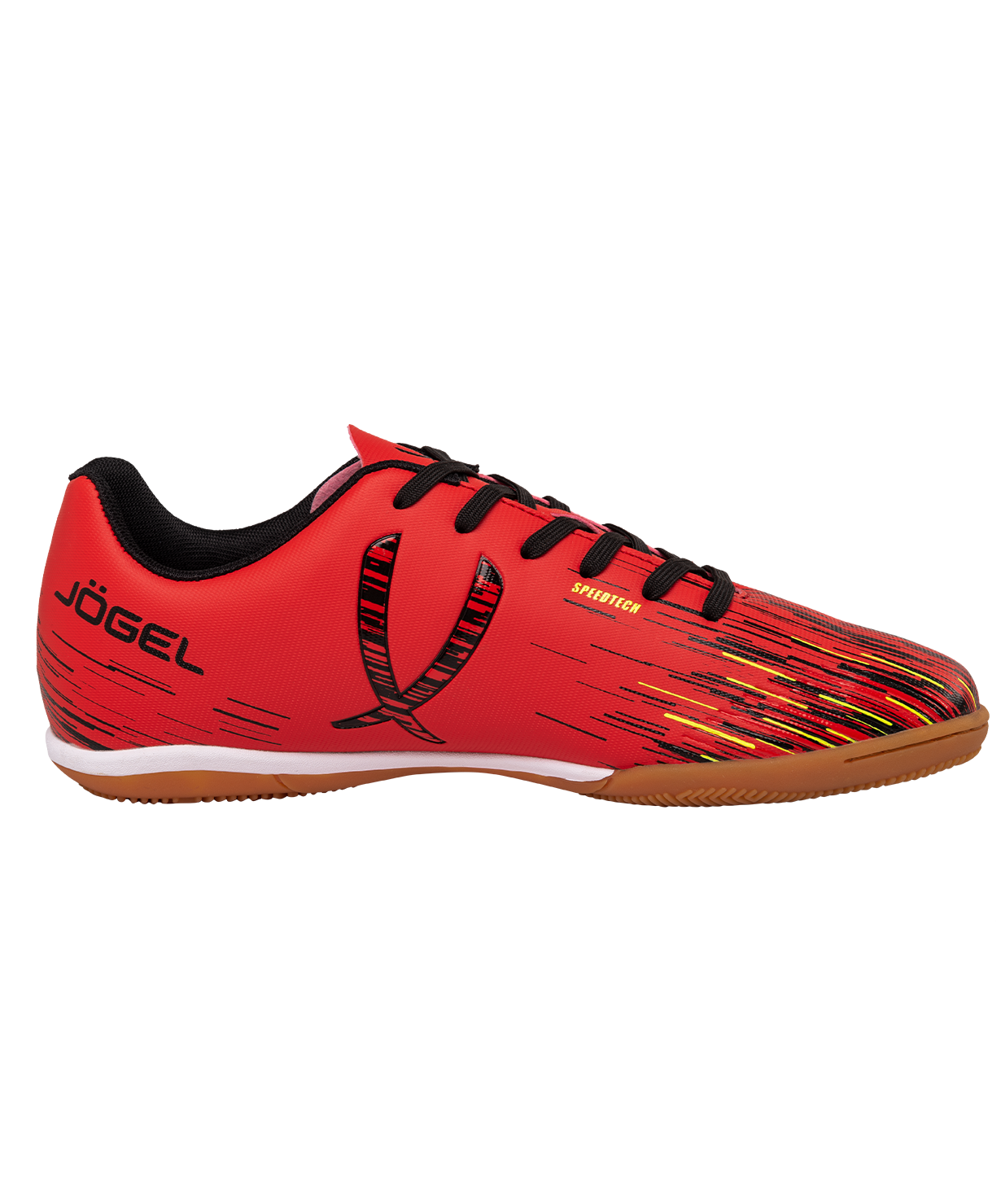 Новое поколение модели Rapido из линейки neo.Sprint. Бутсы отлично подходят для зала, для игры на любых ровных поверхностях и даже для повседневной носки. Они стали практичнее, комфортнее и технологичнее.\nВ Rapido используется технология Speedtech для максимальной скорости на поле. Новая форма анатомической колодки для еще более правильного положения стопы. Носочная часть усилена дополнительной прошивкой. Мягкая стелька из материала ЭВА смягчает нагрузку и обеспечивает необходимый комфорт. Для обеспечения дополнительного вентилирования в язычке сделаны специальные отверстия. Подошва обуви выполнена по технологии Non-marking, что обеспечивает безупречное сцепление с поверхностями, обувь не оставляет следов на паркете.\nВ производстве обуви Jögel используются только качественные материалы, обувь легко моется и не требует дополнительного ухода.\nТехнология Speedtech - соединение облегченных материалов и динамичной конструкции бутсы, что позволяет футболисту раскрыть свои скоростные способности.\nХарактеристики:\nМатериал верха: полиуретан\nМатериал подкладки обуви: текстиль\nМатериал подошвы обуви: резина\nМатериал стельки: ЭВА, текстиль\nПолнота обуви: D\nРазмерный ряд: 34-40 (RU)\nВид застежки: шнурки\nТип подошвы: зальная\nОсновной цвет: красный\nДополнительные цвета: желтый/синий\nНазначение обуви: спорт, футбол, повседневная\nРекомендованные покрытия: паркет, ровные твердые поверхности\nСезон: демисезон\nПол: унисекс\nСтрана производства: КНР\nКомплектация: бутсы, коробка