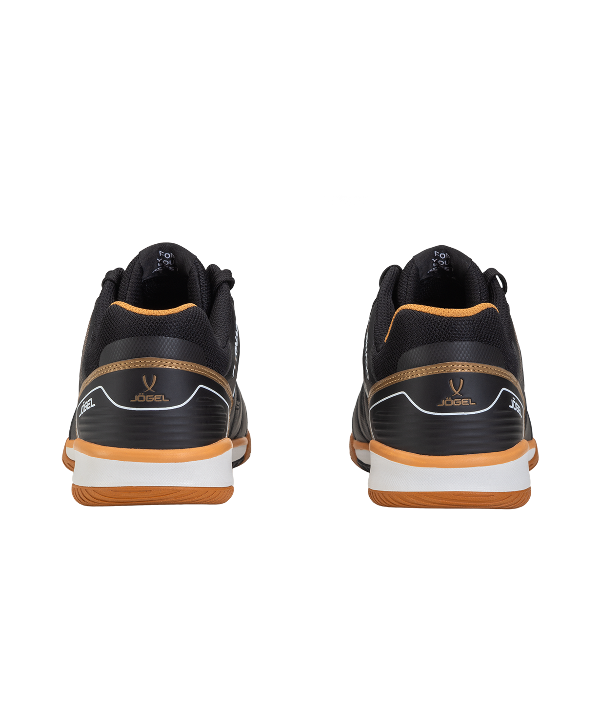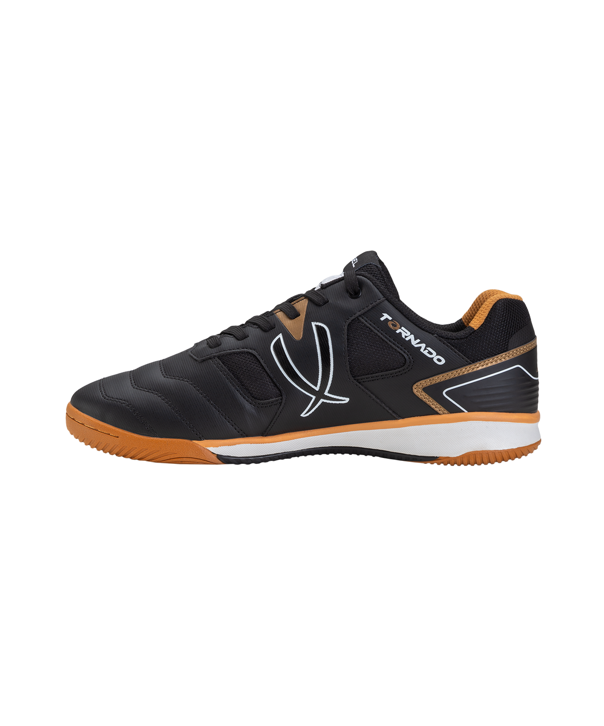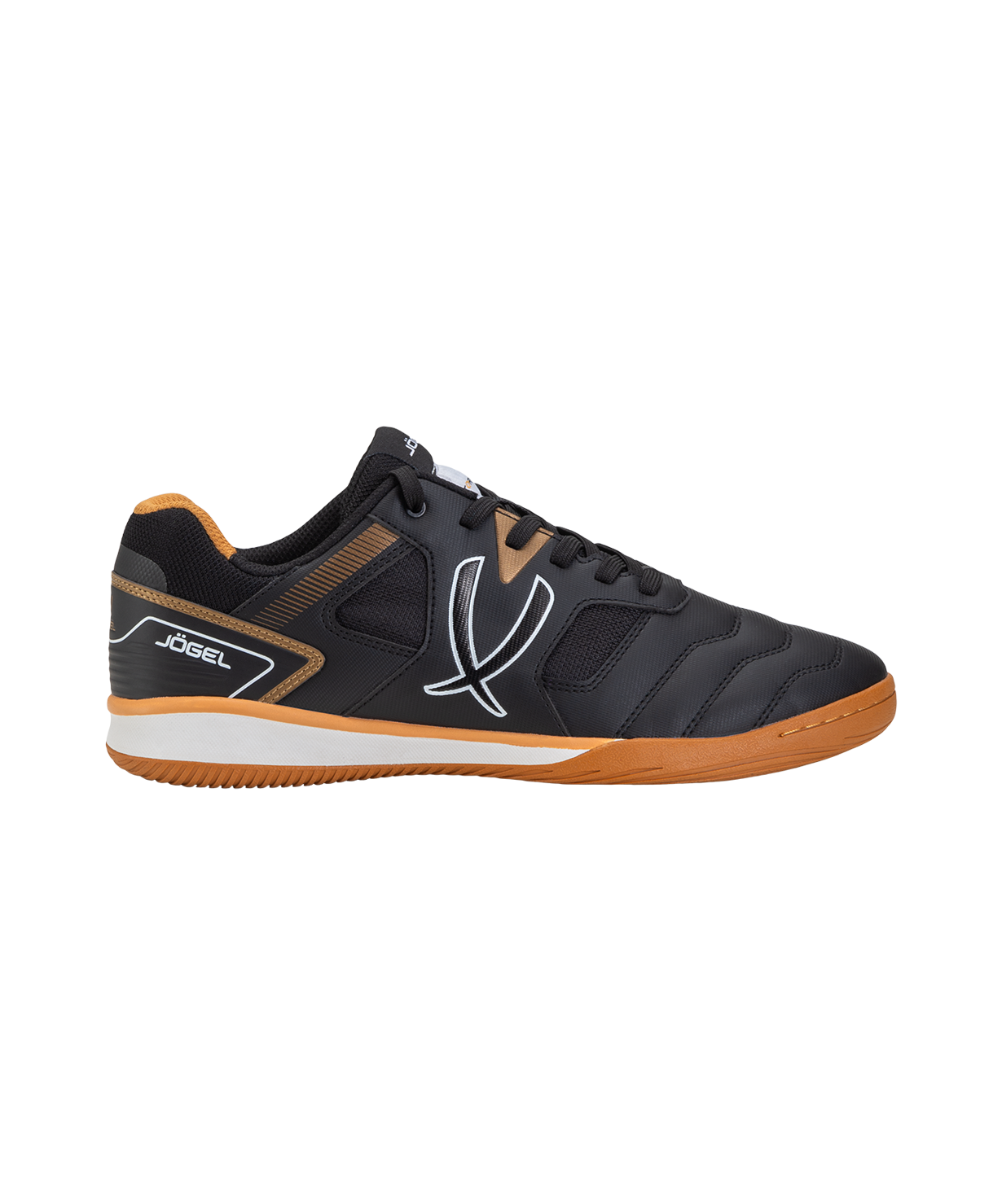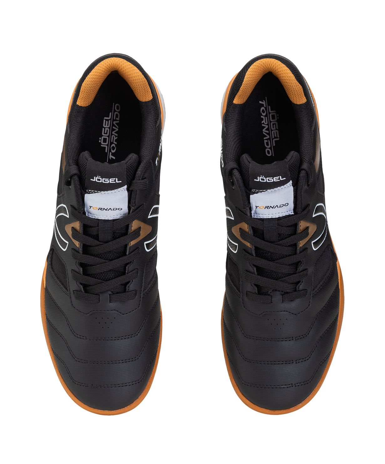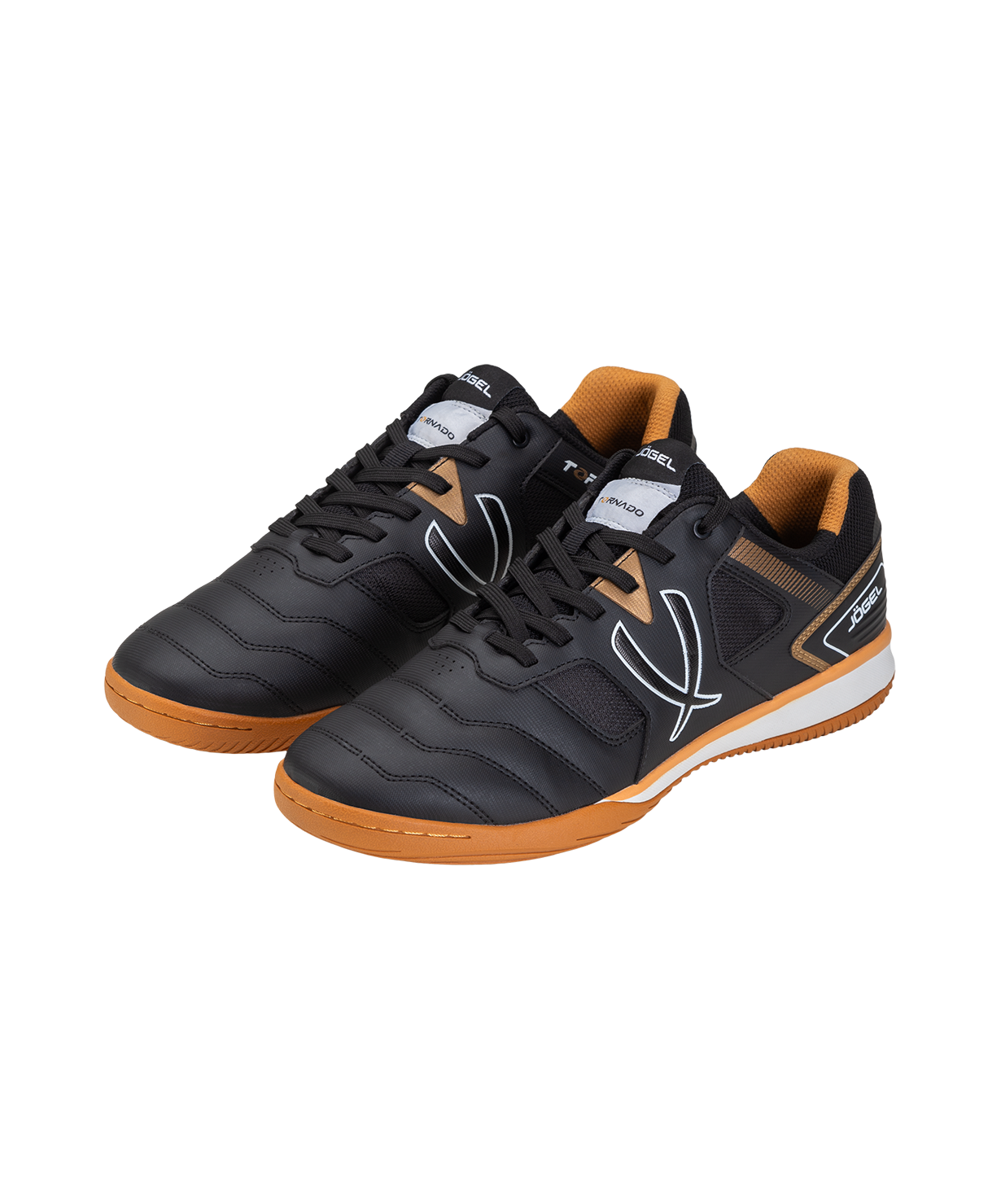 Бутсы для зала Tornado 2.0 от Jögel разработаны с учетом всех потребностей футболистов. Сочетание легкости, комфорта и надежности с ярким лаконичным дизайном будет актуально для спортсменов разного уровня. Конструкция бутс, материалы и технологии, применяемые для производства данной модели, обеспечивают маневренность игрока, снижение ударных нагрузок, защиту стопы и контроль ведения мяча. Сетка отвечает за лучшую вентиляцию и легкий вес обуви.\nПодошва, состоящая из Phylon в промежуточной части, улучшает гибкость и амортизацию, а подметка из резины гарантирует идеальное сцепление с игровой поверхностью. Текстильная подкладка отличается высокой износостойкостью и приятна на ощупь. Детали верха и язычок футзалок выполнены из сетки для лучшей вентиляции и легкости конструкции.\nJögel Tornado 2.0 позволяют оставаться максимально результативным на поле во время тренировок и игр.\nДля производства спортивной обуви Jögel используются только качественные материалы, изделия легко моются и не требуют дополнительного ухода.\nСила внутри! А еще внутри каждой коробки с бутсами вы найдете стильные стикеры с изображениями командных видов спорта и логотипом Jögel. Их можно наклеить на любую ровную и гладкую поверхность, добавив индивидуальности своим аксессуарам.\nПреимущества:\nНадежная фиксация стопы;\nДетали берца и задинки обеспечивают необходимую жесткость конструкции;\nДетали верха и язычок из сетки для лучшей вентиляции и легкости;\nПриятная на ощупь подкладка с высокой износостойкостью;\nПромежуточная подошва из Phylon для лучшей гибкости и отменной амортизации;\nПодметка из резины non-marking для надежного сцепления обуви с поверхностью.\nХарактеристики:\nМатериал верха: полиуретан, текстильная сетка (полиэстер)\nМатериал подкладки обуви: текстиль (полиэстер)\nМатериал подошвы обуви: филон, резина\nМатериал стельки: этиленвинилацетат, текстиль\nПолнота обуви: Е\nРазмерный ряд: 36-46 (RU)\nОсновной цвет: черный\nДополнительные цвета: золотой\nВид застежки: шнурки\nТип подошвы: зальная\nНазначение обуви: спорт, футбол, повседневная\nРекомендованные покрытия: паркет, ровные твердые поверхности\nКомплектация: бутсы, коробка\nВес пары, г: для 36-39: 570, для 40-42: 600, для 43-46: 630\nТип упаковки: коробка со стикером\nСтрана производства: Китай