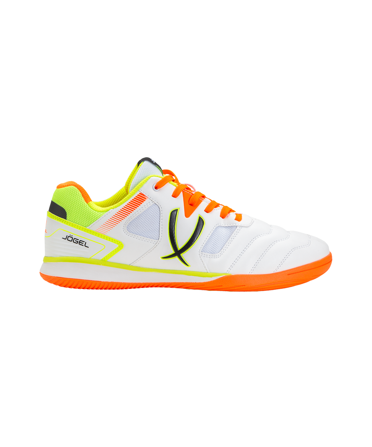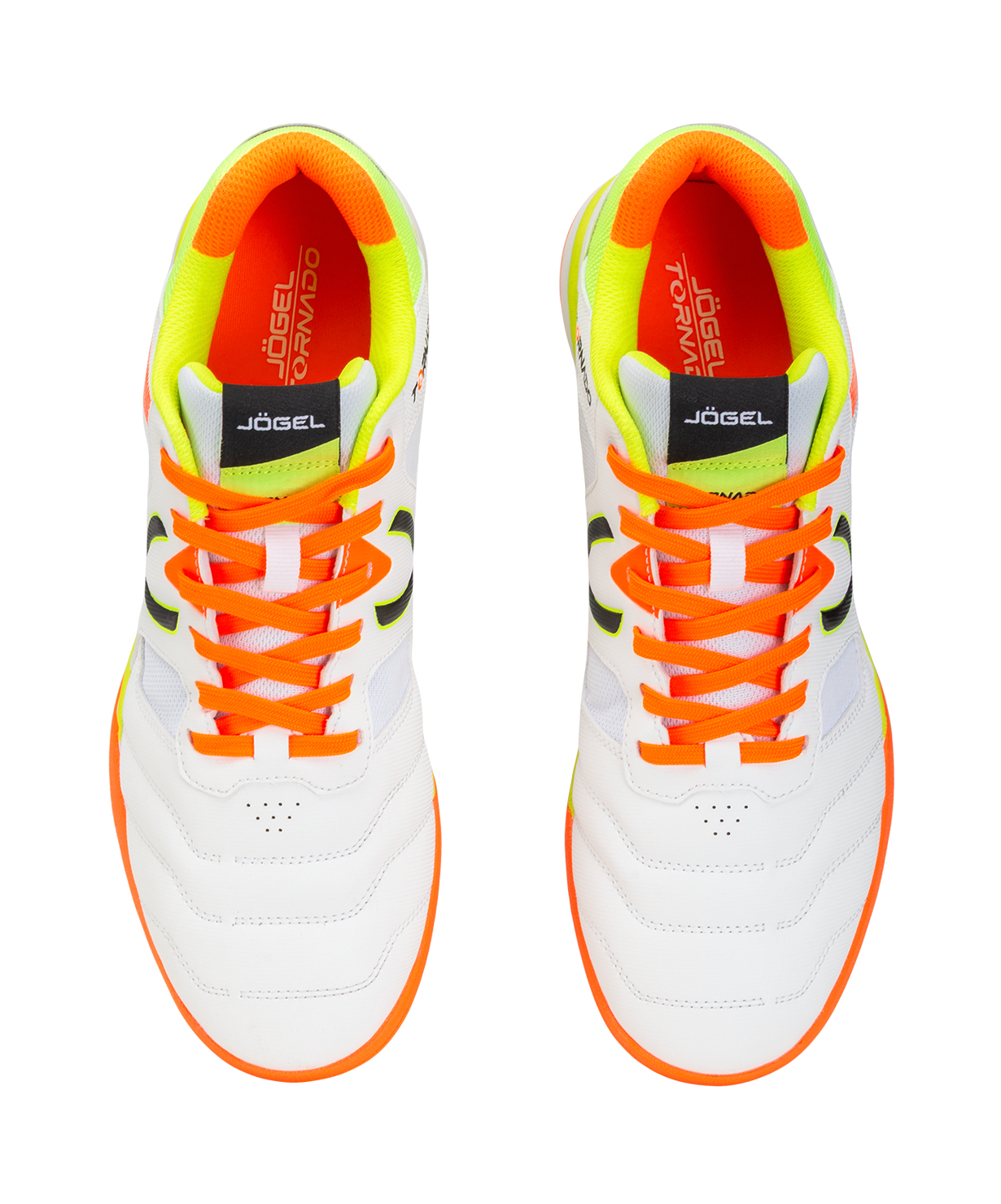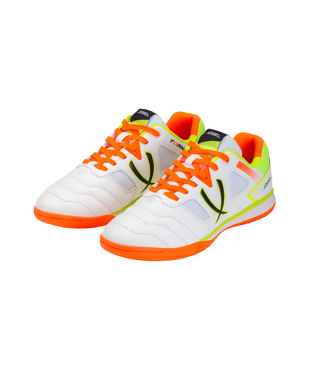 Бутсы для зала Tornado 2.0 от Jögel разработаны с учетом всех потребностей футболистов. Сочетание легкости, комфорта и надежности с ярким лаконичным дизайном будет актуально для спортсменов разного уровня. Конструкция бутс, материалы и технологии, применяемые для производства данной модели, обеспечивают маневренность игрока, снижение ударных нагрузок, защиту стопы и контроль ведения мяча. Сетка отвечает за лучшую вентиляцию и легкий вес обуви.\nПодошва, состоящая из Phylon в промежуточной части, улучшает гибкость и амортизацию, а подметка из резины гарантирует идеальное сцепление с игровой поверхностью. Текстильная подкладка отличается высокой износостойкостью и приятна на ощупь. Детали верха и язычок футзалок выполнены из сетки для лучшей вентиляции и легкости конструкции.\nJögel Tornado 2.0 позволяют оставаться максимально результативным на поле во время тренировок и игр.\nДля производства спортивной обуви Jögel используются только качественные материалы, изделия легко моются и не требуют дополнительного ухода.\nСила внутри! А еще внутри каждой коробки с бутсами вы найдете стильные стикеры с изображениями командных видов спорта и логотипом Jögel. Их можно наклеить на любую ровную и гладкую поверхность, добавив индивидуальности своим аксессуарам.\nПреимущества:\nНадежная фиксация стопы;\nДетали берца и задинки обеспечивают необходимую жесткость конструкции;\nДетали верха и язычок из сетки для лучшей вентиляции и легкости;\nПриятная на ощупь подкладка с высокой износостойкостью;\nПромежуточная подошва из Phylon для лучшей гибкости и отменной амортизации;\nПодметка из резины non-marking для надежного сцепления обуви с поверхностью.\nХарактеристики:\nМатериал верха: полиуретан, текстильная сетка (полиэстер)\nМатериал подкладки обуви: текстиль (полиэстер)\nМатериал подошвы обуви: филон, резина\nМатериал стельки: этиленвинилацетат, текстиль\nПолнота обуви: Е\nРазмерный ряд: 36-46 (RU)\nОсновной цвет: белый\nДополнительные цвета: оранжевый\nВид застежки: шнурки\nТип подошвы: зальная\nНазначение обуви: спорт, футбол, повседневная\nРекомендованные покрытия: паркет, ровные твердые поверхности\nКомплектация: бутсы, коробка\nВес пары, г: для 36-39: 570, для 40-42: 600, для 43-46: 630\nТип упаковки: коробка со стикером\nСтрана производства: Китай