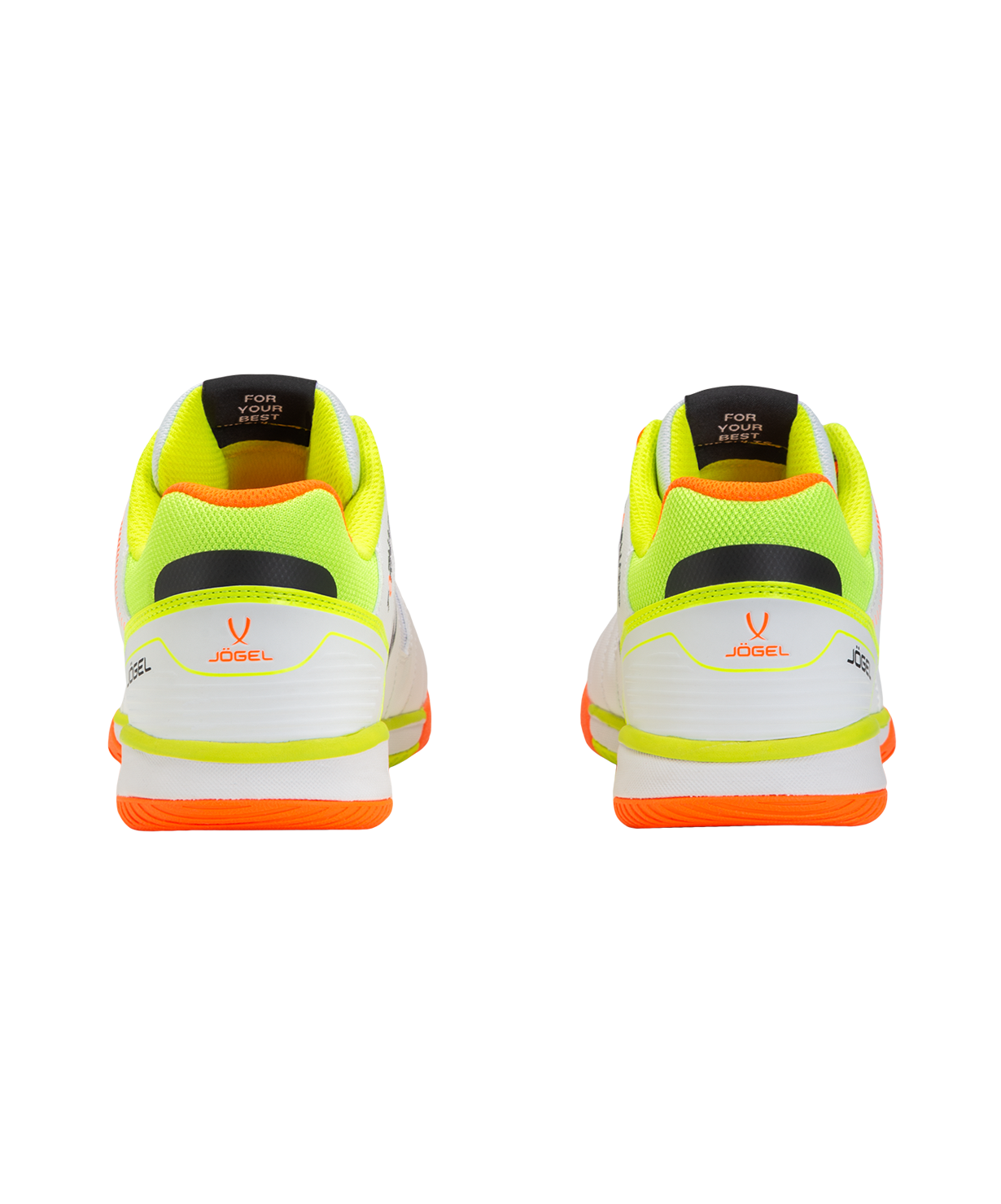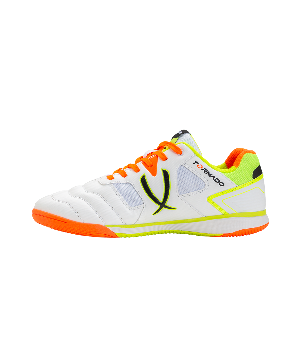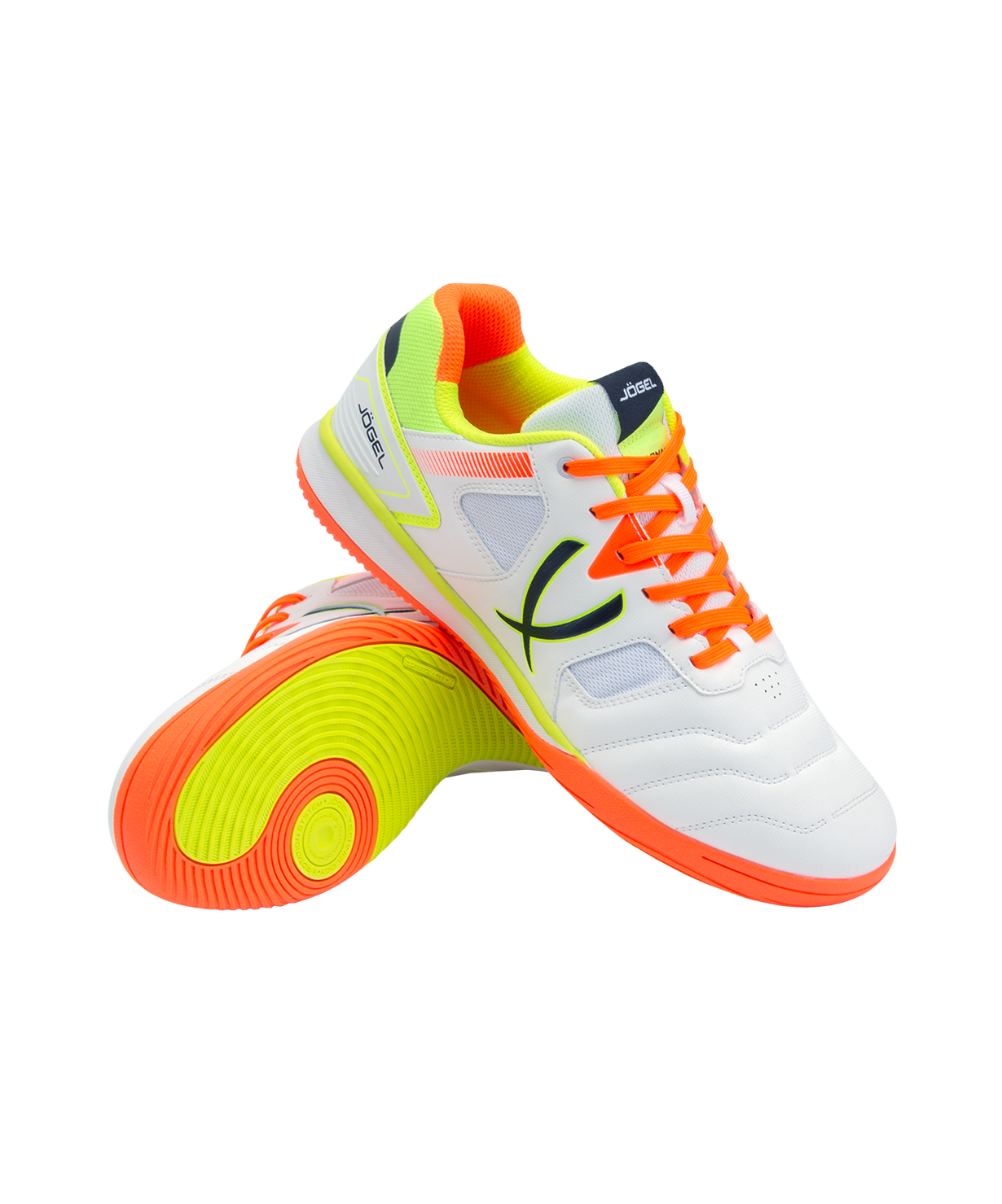 Бутсы для зала Tornado 2.0 от Jögel разработаны с учетом всех потребностей футболистов. Сочетание легкости, комфорта и надежности с ярким лаконичным дизайном будет актуально для спортсменов разного уровня. Конструкция бутс, материалы и технологии, применяемые для производства данной модели, обеспечивают маневренность игрока, снижение ударных нагрузок, защиту стопы и контроль ведения мяча. Сетка отвечает за лучшую вентиляцию и легкий вес обуви.\nПодошва, состоящая из Phylon в промежуточной части, улучшает гибкость и амортизацию, а подметка из резины гарантирует идеальное сцепление с игровой поверхностью. Текстильная подкладка отличается высокой износостойкостью и приятна на ощупь. Детали верха и язычок футзалок выполнены из сетки для лучшей вентиляции и легкости конструкции.\nJögel Tornado 2.0 позволяют оставаться максимально результативным на поле во время тренировок и игр.\nДля производства спортивной обуви Jögel используются только качественные материалы, изделия легко моются и не требуют дополнительного ухода.\nСила внутри! А еще внутри каждой коробки с бутсами вы найдете стильные стикеры с изображениями командных видов спорта и логотипом Jögel. Их можно наклеить на любую ровную и гладкую поверхность, добавив индивидуальности своим аксессуарам.\nПреимущества:\nНадежная фиксация стопы;\nДетали берца и задинки обеспечивают необходимую жесткость конструкции;\nДетали верха и язычок из сетки для лучшей вентиляции и легкости;\nПриятная на ощупь подкладка с высокой износостойкостью;\nПромежуточная подошва из Phylon для лучшей гибкости и отменной амортизации;\nПодметка из резины non-marking для надежного сцепления обуви с поверхностью.\nХарактеристики:\nМатериал верха: полиуретан, текстильная сетка (полиэстер)\nМатериал подкладки обуви: текстиль (полиэстер)\nМатериал подошвы обуви: филон, резина\nМатериал стельки: этиленвинилацетат, текстиль\nПолнота обуви: Е\nРазмерный ряд: 36-46 (RU)\nОсновной цвет: белый\nДополнительные цвета: оранжевый\nВид застежки: шнурки\nТип подошвы: зальная\nНазначение обуви: спорт, футбол, повседневная\nРекомендованные покрытия: паркет, ровные твердые поверхности\nКомплектация: бутсы, коробка\nВес пары, г: для 36-39: 570, для 40-42: 600, для 43-46: 630\nТип упаковки: коробка со стикером\nСтрана производства: Китай