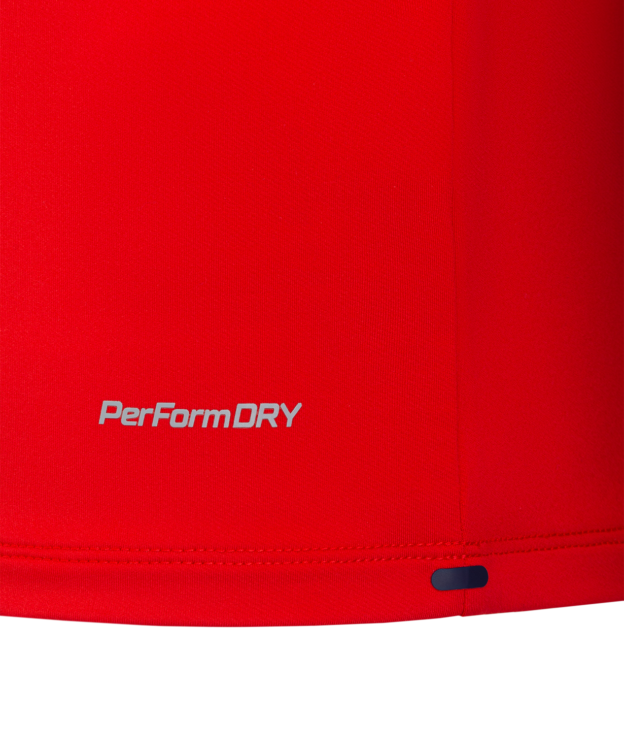 Тренировочный джемпер из легкого эластичного материала (93% полиэстер, 7% спандекс) с применением технологии эффективного влагоотведения PerFormDRY. Приятный на ощупь материал быстро отводит влагу и высыхает, обеспечивая комфорт даже при самых интенсивных тренировках. Ткань хорошо сохраняет форму даже при длительном использовании, не деформируется, сохраняет цвет. Плотная посадка по фигуре, атлетичный крой. Небольшой воротник-стойка и короткая застежка-молния с контрастной отделкой. Низ удлиненных рукавов имеет специальные петли для больших пальцев. Тиснение с дизайном РФС на боковых вставках, контрастные детали делают джемпер уникальным и эффектным.