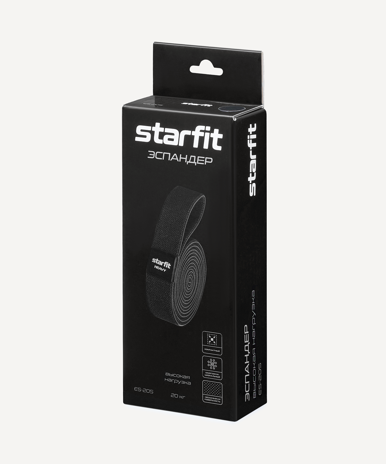 Эспандер для кроссфита STARFIT ES-205 – многофункциональный тренажер для тела, необходимый спортсменам и любителям для комплексного развития мышц и связочно-сухожильного аппарата. Силовая лента изготовлена из прочного текстиля. Долговечный материал прост в уходе и хорошо держит форму.\nДанная модель имеет высокую степень нагрузки Heavy (20 кг) и оптимальна для опытных спортсменов. Для вашего удобства степень нагрузки отмечена на каждом изделии.\nЭспандер поможет активно проработать различные группы мышц, улучшить физическую форму и усовершенствовать растяжку. Силовая лента пригодится для кросс-тренинга, такой спортивный инвентарь для фитнеса дома или в зале способен заменить и дополнить упражнения с тяжелыми весами.\nЭспандер выполнен в стильном дизайне, который будет актуален как для мужчин, так и для женщин.\nЗанимайтесь спортом правильно! При наличии различных травм или заболеваний рекомендуется проконсультироваться с лечащим врачом.\nПреимущества:\nВысокая степень нагрузки;\nМногофункциональный инвентарь;\nПомогает проработать различные группы мышц и усовершенствовать растяжку;\nПрочный текстильный материал;\nКомпактный размер – удобно брать с собой.\nХарактеристики:\nМатериал: полиэстер, латекс\nЦвет: черный\nМаксимальная нагрузка/сопротивление, кг: 20\nОбщая длина, см: 208\nДлина петли, см: 104\nШирина, см: 3\nТолщина, см: 0,3\nМаксимальное растяжение петли, см: 208\nВес без упаковки, кг: 0,12\nТип упаковки: текстильный мешочек, цветной короб\nКоличество в упаковке, шт: 1\nПроизводство: КНР