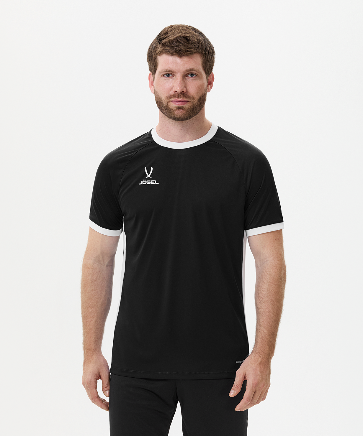 Игровая футболка Element Jersey из линейки Division создана для экипировки профессиональных и любительских команд. Модель выполнена из легкого материала с применением технологии эффективного влагоотведения PerFormDRY. Ткань отличается высокой прочностью и хорошей воздухопроницаемостью. Сетчатые вставки, расположенные по бокам изделия, улучшают циркуляцию воздуха и позволяют чувствовать себя на высоте даже в самой «жаркой» игре. Конструкция не ограничивает свободу движений: атлетический крой и рукав реглан повторяют контуры тела, обеспечивая максимальный комфорт и не отвлекая от тренировок. Контрастные вставки, находящиеся по бокам, внизу манжет и на горловине, придают индивидуальности и идеально сочетаются с логотипом бренда, сделанного из специального силиконового материала по технологии 3D нанесения. Дизайн дополняет rubber принт, расположенный по центру вверху спинки.\nPerFormDRY - это специальная технология обработки тканей Jögel, которая способствует быстрому выведению влаги и помогает спортсменам чувствовать себя комфортно при интенсивных нагрузках.\nПреимущества:\nАтлетический крой;\nМатериал с технологией PerFormDRY;\nКачественное влагоотведение;\nВысокая скорость высыхания;\nЛегкий материал;\nКонтрастные вставки белого цвета и принт.\nХарактеристики:\nСостав: 100% полиэстер\nРазмер: YS, YM, YL, YXL, XS, S, M, L, XL, XXL, XXXL\nЦвет: черный\nВид упаковки: зип пакет с картонной этикеткой и стикером\nСтрана производства: Китай