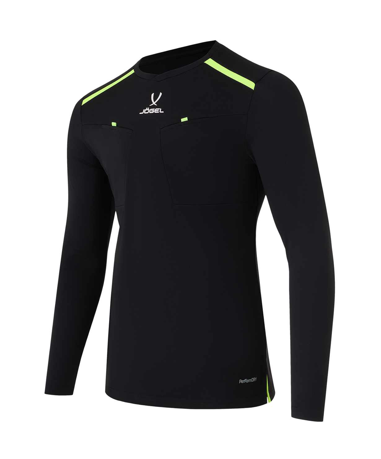 Футболка судейская JÖGEL DIVISION PerFormDRY Referee LS Tee создана для проведения матчей и соревнований команд. Она изготовлена из высококачественного материала с технологией PerFormDRY, ткань имеет хорошие влагоотводящие свойства и отлично пропускает воздух. Модель устойчива к износу, проста в уходе и быстро сохнет.\nФутболка атлетичного силуэта дополнена отрезной кокеткой с контрастными вставками в швах. Оригинальная V-образная горловина выполнена из комбинации риба и основной ткани. Спинка из сетчатой ткани обеспечивает лучшую воздухопроницаемость и влагоотведение.\nНа груди предусмотрены два накладных кармана под карточки, закрывающиеся на velcro-липучку с тесьмой. В центре футболки располагается 3D-логотип бренда.\nReferee Tee позволяет создать гармоничный комплект с судейскими шортами JÖGEL Referee shots.\nPerFormDRY - это специальная технология обработки тканей JÖGEL, которая способствует быстрому выведению влаги и помогает спортсменам чувствовать себя комфортно при интенсивных нагрузках.\nПреимущества:\nУдобная модель с длинным рукавом;\nАтлетичный силуэт;\nСетчатая спинка;\nНакладные карманы с застежками-липучками;\nТехнология PerFormDRY.\nХарактеристики:\nСостав: 100% полиэстер\nЦвет: черный\nРазмер: S, M, L, XL, XXL\nТип упаковки: пакет зип-лок\nПроизводство: Китай