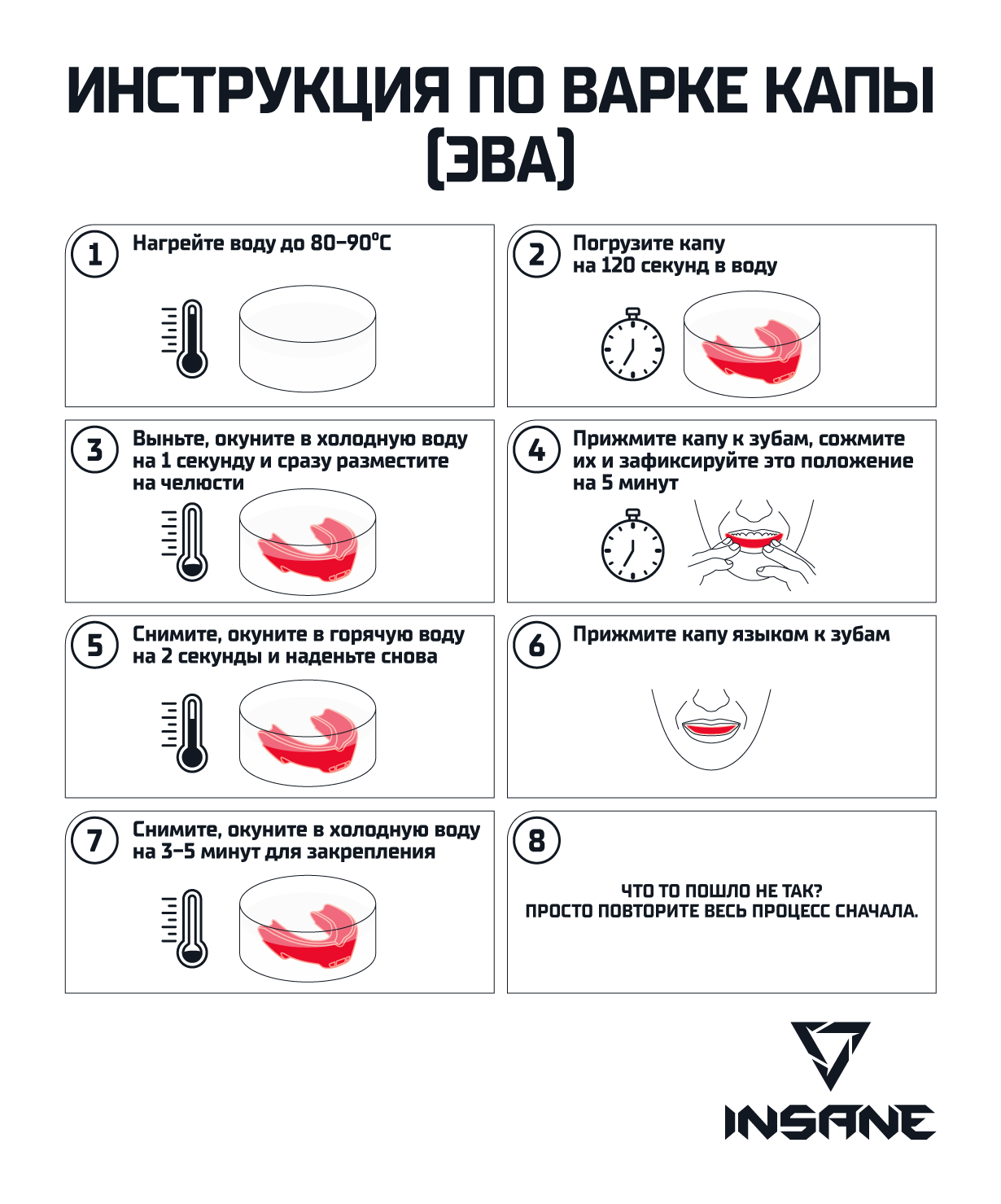 Детская одночелюстная капа LYNX – важный аксессуар для юных бойцов и борцов до 11 лет от бренда INSANE. Боксерская капа выполнена из прочного ударопоглощающего материала EVA. 3 слоя материала обеспечивают максимальную надежность аксессуара, а физические свойства изделия гарантируют удобство дыхания и комфорт во время тренировок и спаррингов. Капа термопластична и после варки приобретает индивидуальную, идеально подходящую спортсмену форму. Модель отличается высокой прочностью и плотностью, поэтому ее необходимо варить дольше, чем тонкие капы (достаточно 120 секунд).\nКапа для зубов для бокса и других видов спорта имеет стильный дизайн. Белый цвет выделяет спортсмена на ринге. LYNX поставляется вместе с прозрачным кейсом для хранения, который защищает капу для карате и других единоборств от загрязнения и позволяет моментально определить, какая именно модель находится перед спортсменом.\nИзделие защищает зубы от выбиваний и сколов, предохраняет ротовую полость и десна от внутренних рассечений. Капа для единоборств LYNX позволяет предотвратить надрыв губ и щек из-за ударов о клыки и острые края зубов, препятствует прикусыванию языка. Аксессуар дополнительно защищает челюсть от вывихов и переломов, а также снижает риск получить черепно-мозговую травму.\nПреимущества:\nДетский размер;\nПрочный материал ЭВА;\nТри слоя защиты;\nПринимает форму зубов и рассеивает ударную силу;\nМаксимально точная фиксация капы;\nДополнительные амортизационные вкладки;\nОтверстия для облегчения дыхания;\nТермопластичная;\nПрозрачный кейс в комплекте.\nХарактеристики:\nРазмер: детский (до 11 лет)\nMатериал капы: этиленвинилацетат\nКоличество слоев: 3\nMатериал футляр: пластик\nКомплектация: 1 капа в футляре\nТип упаковки: пластиковый футляр\nПроизводство: Китай\nВес нетто, г: 11