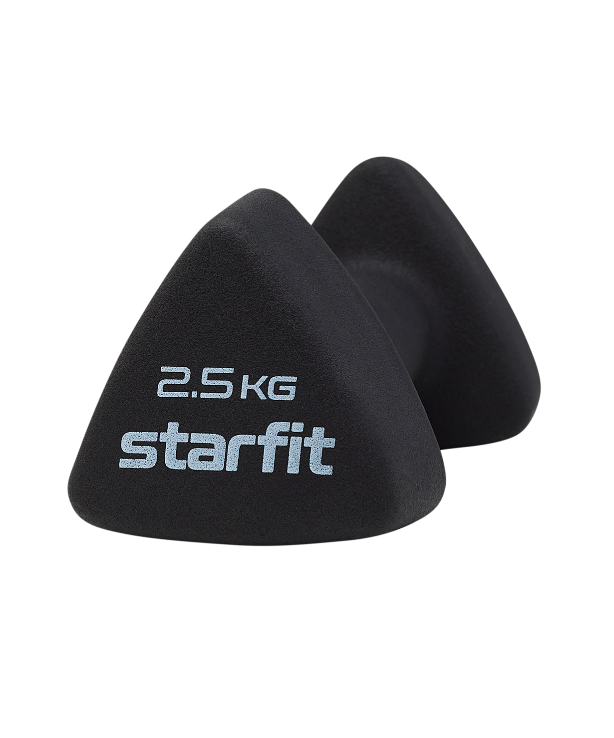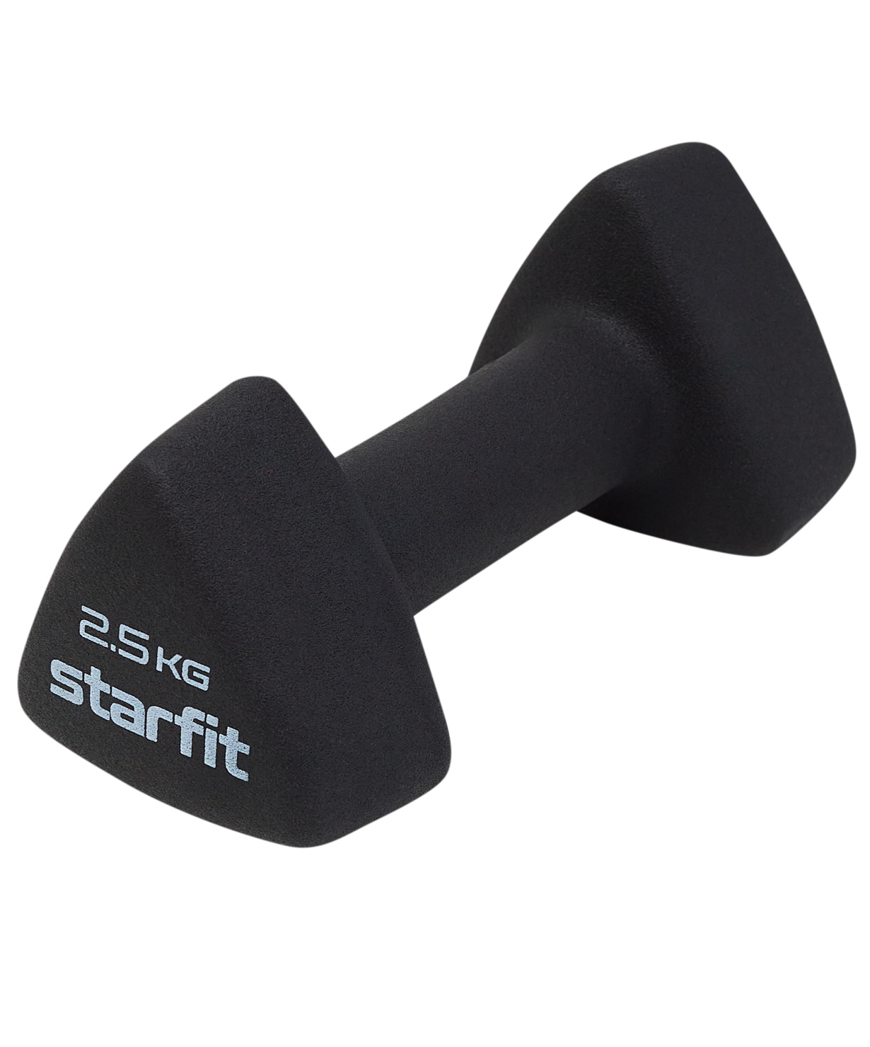 Гантель неопреновая DB-205 от Starfit 2,5 кг – надежный помощник в спорте. Одной из значимых особенностей изделия является ее уникальная треугольная форма. Она не только устраняет проблему перекатывания инвентаря по полу, снижая риск травм спортсмена и его окружения, но и выглядит современно и необычно.\nЭтот тренировочный инвентарь приятен на ощупь и комфортен по температуре для ладоней. Он идеально подходит для дома, так как не царапает пол и минимизирует шум от ударов о напольное покрытие.\nГантель 2,5 кг – незаменимый снаряд для тренировки мышечного каркаса. Такая нагрузка активно используется для тренировок в зале, применяется в лечебной физкультуре, беге и других видах спорта. Вес изделия также расширяет сферу применения, позволяя использовать этот спортивный инвентарь мужчинам, женщинам и детям.\nПреимущества:\nОригинальная треугольная форма;\nНеопреновое покрытие;\nПриятно брать в руку.\nХарактеристики:\nЦвет: черный\nВес без упаковки, кг: 2,5\nВнешний материал: неопрен\nВнутренний материал: чугун\nДлина, см: 18\nШирина, см: 8,2\nДлина хвата, см: 9,4\nТолщина хвата, см: 3,4\nТип упаковки: термоусадочная пленка со стикером\nКоличество в упаковке, шт: 1\nПроизводство: КНР