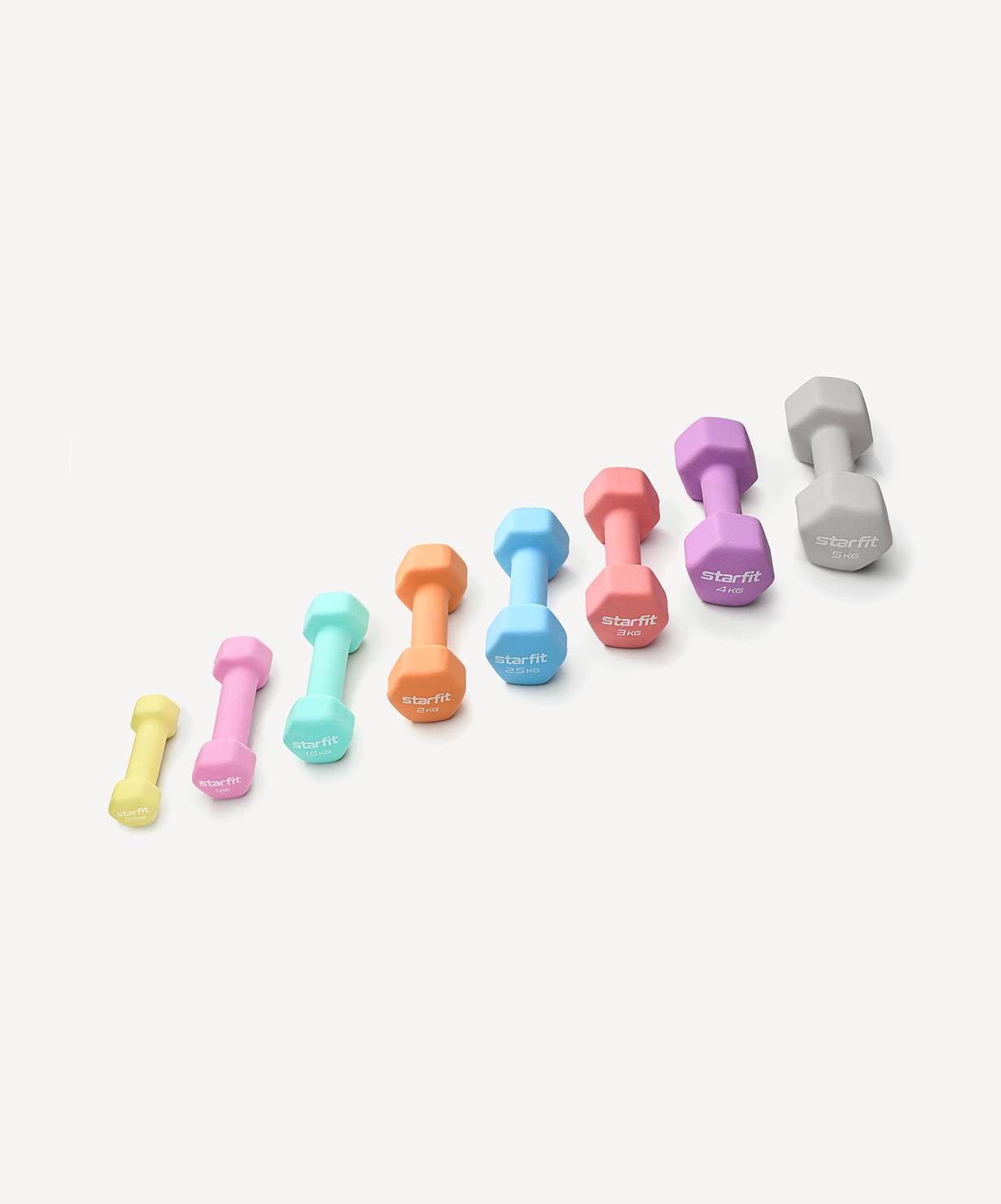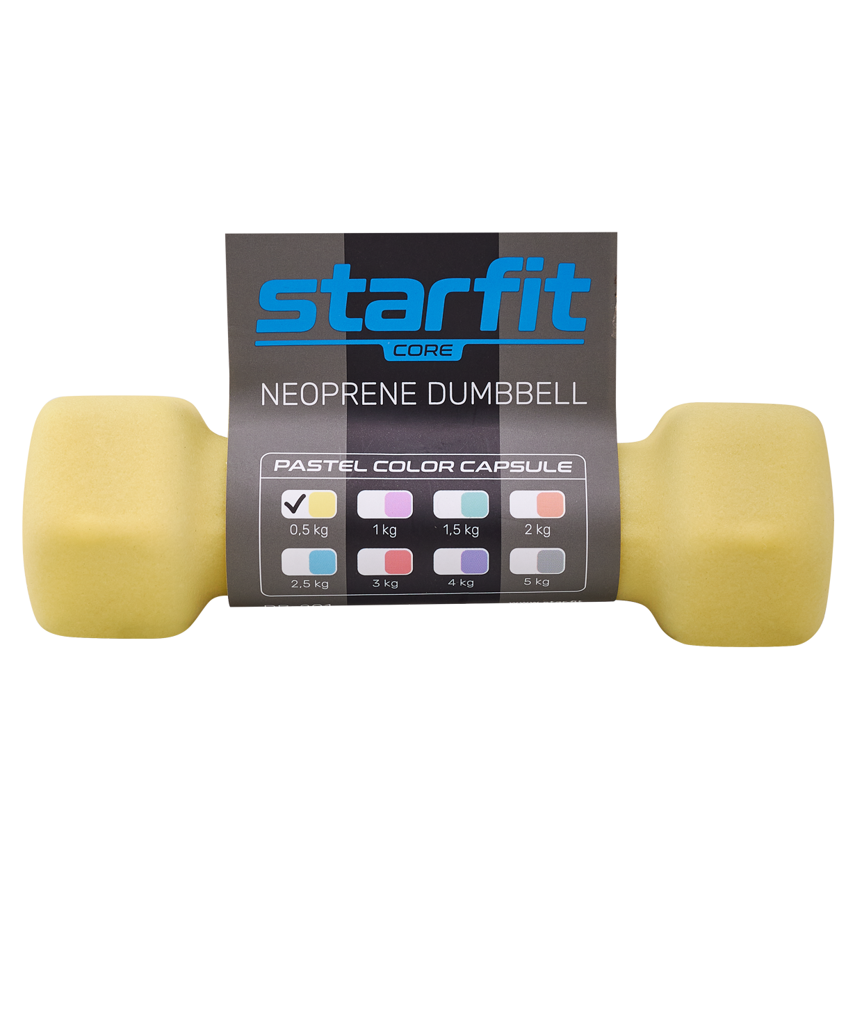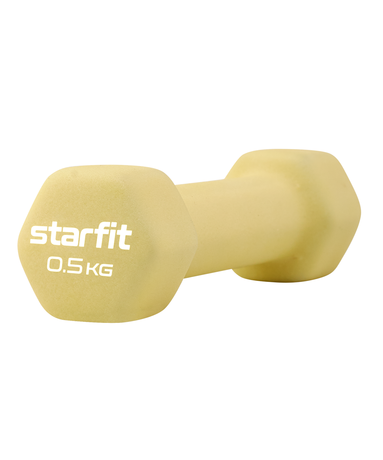 Гантель неопреновая DB-201 0,5 кг от STARFIT - надежный помощник в спорте. Она изготовлена из чугуна, который известен своей прочностью и долговечностью. Гантели из чугуна могут служить годами без потери качества. Верхнее покрытие снаряда выполнено из высококачественного неопрена. Свойства материала позволяют поверхности гантели поглощать часть влаги с ладоней, что обеспечивает цепкий хват. Неопреновый слой приятен на ощупь и комфортен по температуре для ладоней (изделие не перегреется, находясь на солнце, и не вызовет дискомфорт при тренировках на улице в холодную погоду). Такие гантели оптимально подойдут для фитнеса в домашних условиях, так как не царапают пол и не издают много шума при случайных ударах о напольное покрытие.\nDB-201 имеет гексагональную форму. Это позволяет устранить проблему перекатывания по полу, снижая риск травм спортсмена и его окружения.\nГексагональная легкая гантель – незаменимый снаряд для тренировки мышечного каркаса. Такие веса активно используются в фитнесе и функциональном тренинге. Гантели весом 500 грамм применяются в лечебной физкультуре, беге и других видах спорта. Вес изделия также расширяет сферу применения, позволяя использовать этот спортинвентарь мужчинам, женщинам и даже детям.\nПреимущества:\nПриятное на ощупь неопреновое покрытие;\nУдобная гексагональная форма;\nОбеспечивает цепкий хват;\nИзготовлена из прочного чугуна;\nАктуальный цвет.\nХарактеристики:\nЦвет: желтый пастель\nВес без упаковки, кг: 0,5\nВнешний материал: неопрен\nВнутренний материал: чугун\nДлина, см: 13\nШирина, см: 4,2\nВысота, см: 3,9\nДлина хвата, см: 6\nДиаметр хвата, см: 2,7\nТип упаковки: запаянный пакет со стикером\nКоличество в упаковке, шт: 1\nПроизводство: КНР