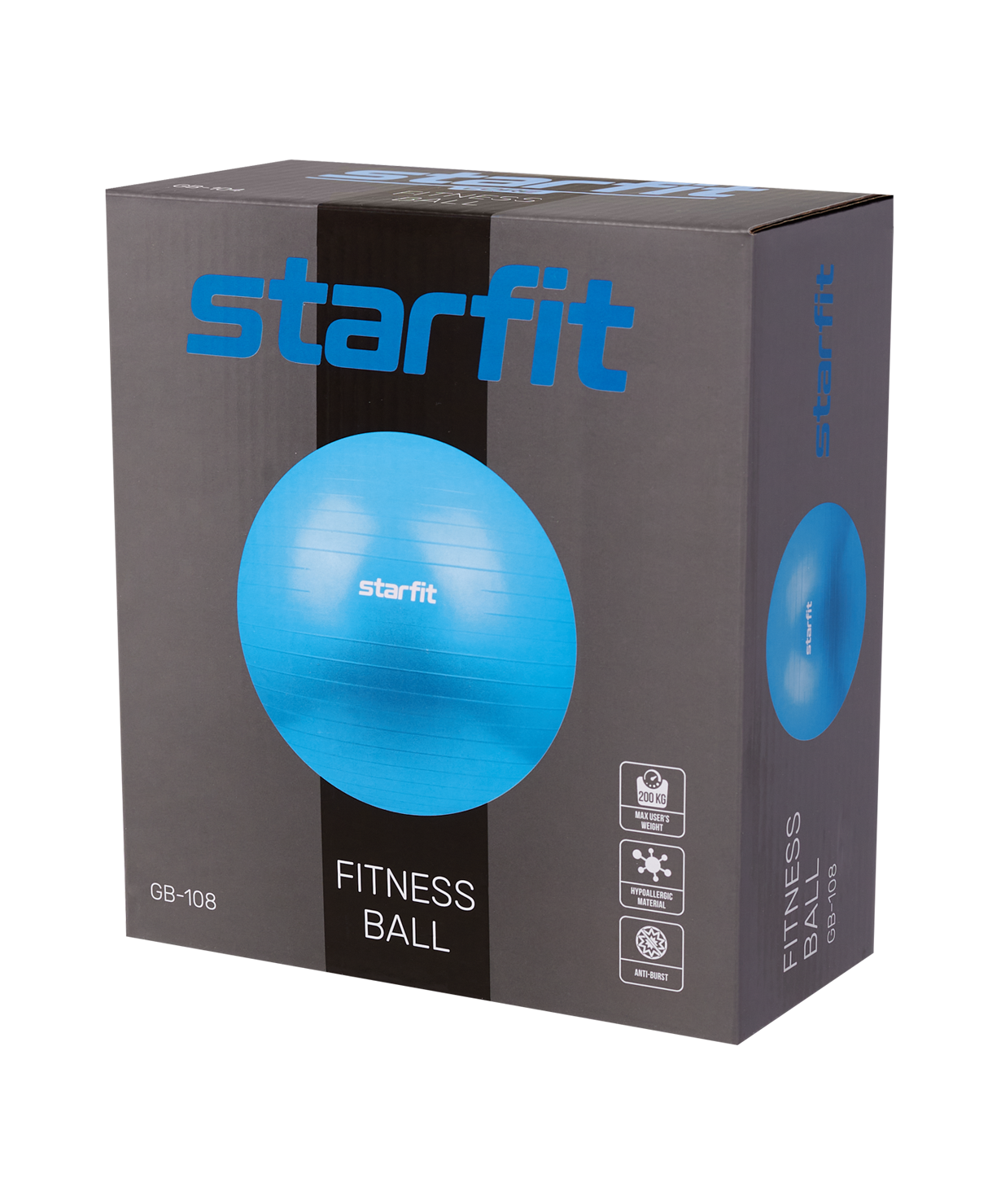 Фитбол GB-108 бренда STARFIT – полезный спортивный инвентарь для фитнеса дома и в зале, улучшающий координацию движений и развивающий чувство равновесия. Он позволяет тренировать все мышцы тела, вы можете использовать фитнес мяч как основной или второстепенный снаряд, применяя и другие спортивные товары для фитнеса. Фитбол 75 см также оптимален для восстановления после травм. Фитнес шар – это и шар гимнастический, оказывающий оздоровительный массаж. Такой гимнастический мяч помогает снять напряжение со связочного аппарата и расслабиться после долгого дня. Безопасность занятий обеспечивает система «Антивзрыв».\nМяч для фитнеса 75 см приятен на ощупь, он комфортен и взрослым, и детям, поэтому шар для фитнеса часто используют как фитбол для беременных женщин, и как мяч гимнастический 75 см для укачивания малышей. Мяч фитбол компактен в сдутом состоянии, поэтому он пользуется спросом у покупателей, выбирающих товары для тренировок дома.\nПреимущества:\nКомпактное хранение;\nСистема «Антивзрыв»;\nДля тренировок, укрепления здоровья и укачивания детей.\nХарактеристики:\nДиаметр, см: 75\nМатериал: поливинилхлорид\nЦвет: синий пастель\nМаксимальный вес пользователя, кг: 200\nСистема "антивзрыв": имеется\nВес без упаковки, гр: 1200\nТип упаковки: цветная коробка\nКоличество в упаковке, шт: 1\nПроизводство: КНР