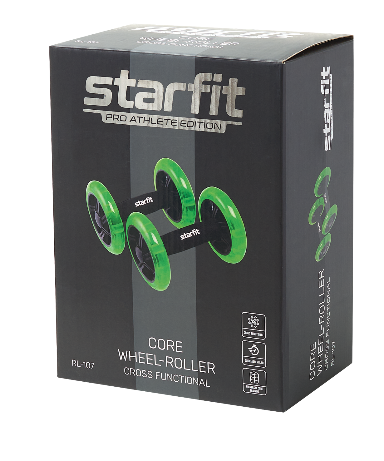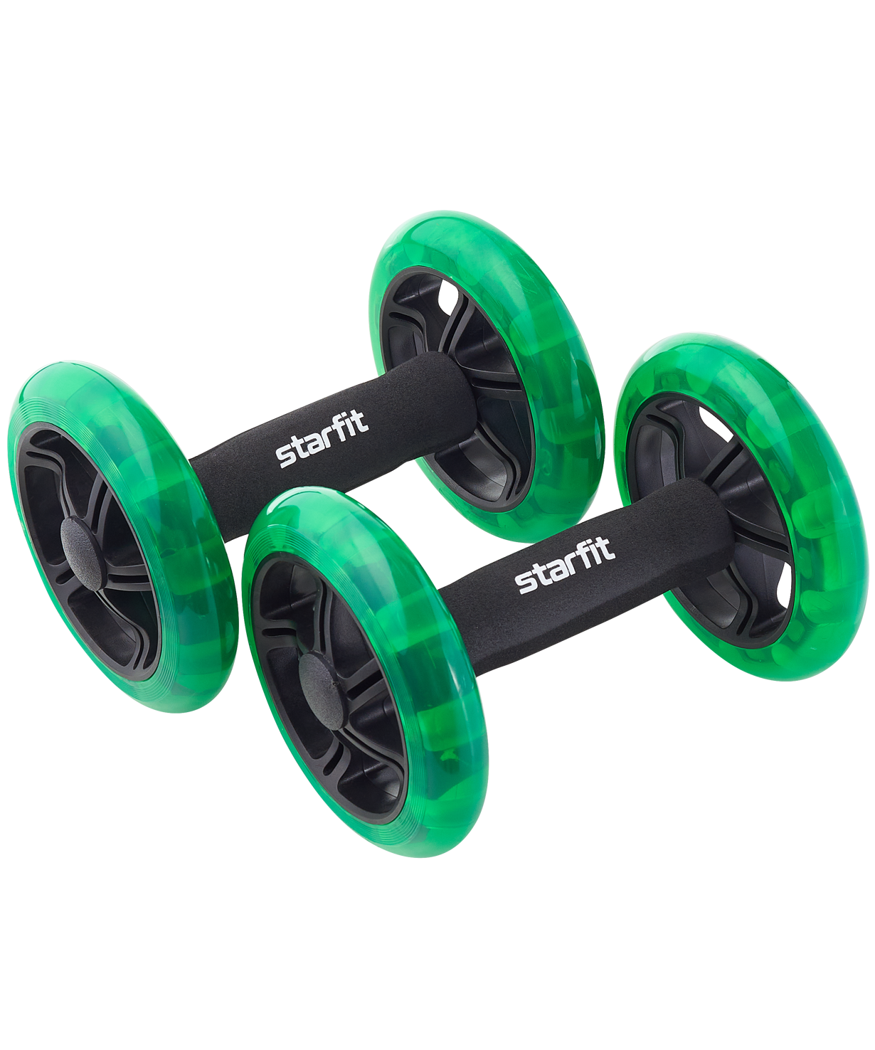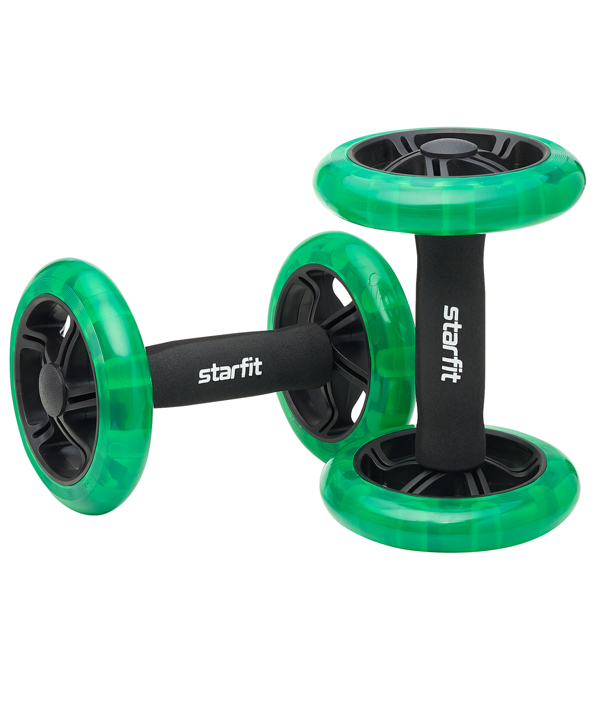 Ролик для пресса RL-107 от STARFIT – экспертный снаряд, предназначенный для укрепления мышц кора и брюшного пресса. С его помощью вы сможете улучшить рельеф, ускорить процесс жиросжигания, выправить осанку и избавиться от болей в спине. Этот тренажер для пресса является одним из бестселлеров у покупателей, ищущих товары для похудения живота, а также продукцию для фитнес-тренировок.\nГимнастический ролик для пресса двойной, раздельные колеса усложняют тренинг и делают возможным выполнение упражнений одной рукой, что позволяет разнообразить тренировки. Неопреновые ручки предотвращают образование мозолей и создают условия для комфортного хвата, а полиуретановое покрытие обеспечивает мягкий накат и не портит пол. Ролик гимнастический не займет много места, его компактные размеры позволяют брать тренажер с собой в поездки или использовать его в небольших помещениях. Колесо для пресса готово к использованию прямо из коробки, изделие не требует дополнительной сборки.\nПреимущества:\nРаздельные колеса, экспертный уровень;\nНеопреновые ручки;\nПроработка различных групп мышц;\nВысокая эффективность по сравнению с обычными скручиваниями.\nХарактеристики:\nМатериал: пластик, металл, неопрен\nКоличество колес: 2\nЦвет: черный/ярко-зеленый\nДиаметр колес, см: 14\nШирина колеса, см: 2,7\nВнутренний материал ручки: металл\nВнешний материал ручки: неопрен\nДлина ручки, см: 14,7\nДиаметр ручки, см: 4,1\nШирина ролика от края до края, см: 20,5\nМаксимальный вес пользователя, кг: 200\nВес без упаковки, кг: 1,3\nУпаковка: картонная цветная коробка\nКоличество в упаковке, шт: 2\nПроизводство: КНР