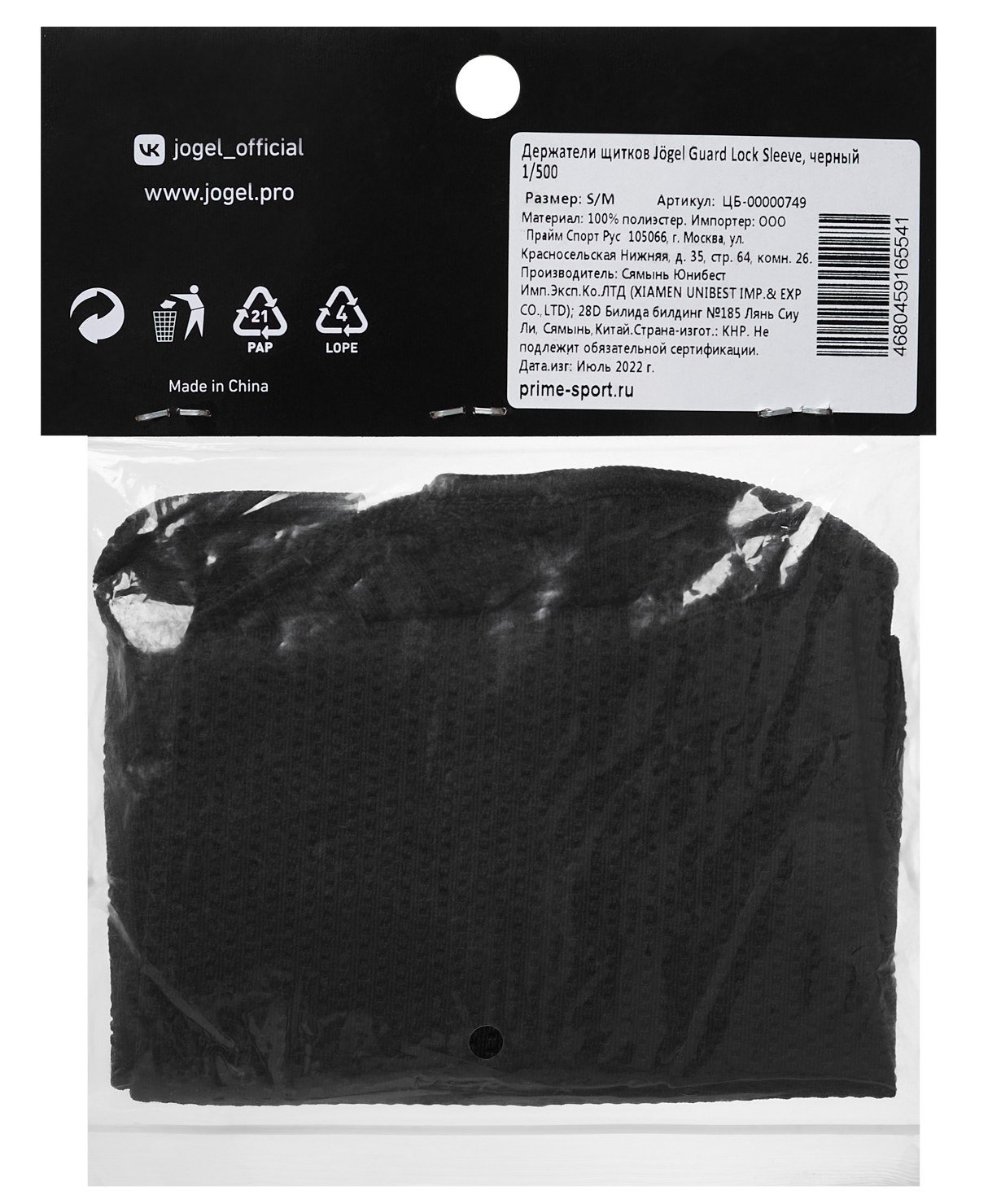 Держатели щитков Jögel Guard Lock Sleeve помогут сделать игру безопаснее и комфортнее.\nJögel Guard Lock Sleeve - это эластичные рукава, которые надежно фиксируют щитки на ногах. Они не только удерживают защиту на нужном месте, но и предотвращают смещение щитков во время движения или ударов по мячу. Вентилируемый сетчатый материал изделия дарит дополнительный комфорт даже на самых интенсивных тренировках. На передней части держателей расположен узнаваемый логотип бренда, поэтому модель отлично подойдет к футбольной форме Jögel.\nПреимущества:\nЭластичный материал;\nХорошая вентилируемость;\nНадежная фиксация щитков.\nХарактеристики:\nМатериал: 100% полиэстер\nРазмер: S/M, L/XL\nЦвет: черный\nТип фиксации: эластичный вентилируемый носок на голень\nНазначение: футбол\nДлина, см: 23\nШирина верха в полуобхвате, см: S/M - 12,5, L/XL - 13,5\nШирина низа в полуобхвате, см: S/M - 9,5, L/XL - 10,5\nВ комплекте, шт: 2\nПроизводство: КНР