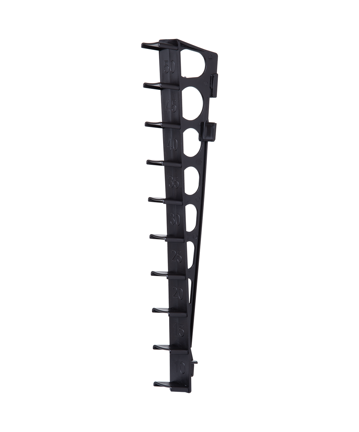Пластиковый держатель для набора Jögel – спортивный инвентарь, который помогает тренерам и спортсменам варьировать упражнения и варианты их исполнения. Держатель прост в использовании, достаточно поместить выступы в отверстия на конусах, чтобы получить эффективный инструмент для оттачивания спортивных навыков. Инвентарь также позволяет установить перекладину на различную высоту – шаг составляет 5 сантиметров. А чтобы регулировка не отнимала лишнего времени на тренировках, на держатель нанесены отметки с обозначением соответствующей высоты (в диапазоне от 10 до 50 см).\nДержатель подходит для конусов с отверстием и набора Jump JA-215.\nПреимущества:\nПростая установка на конус;\n10 уровней высоты;\nПромаркированный шаг в 5 см на корпусе.\nХарактеристики:\nМатериал: полиэтилен\nЦвет: черный\nВес, г: 140\nГабариты, см: 4 х 11 х 46