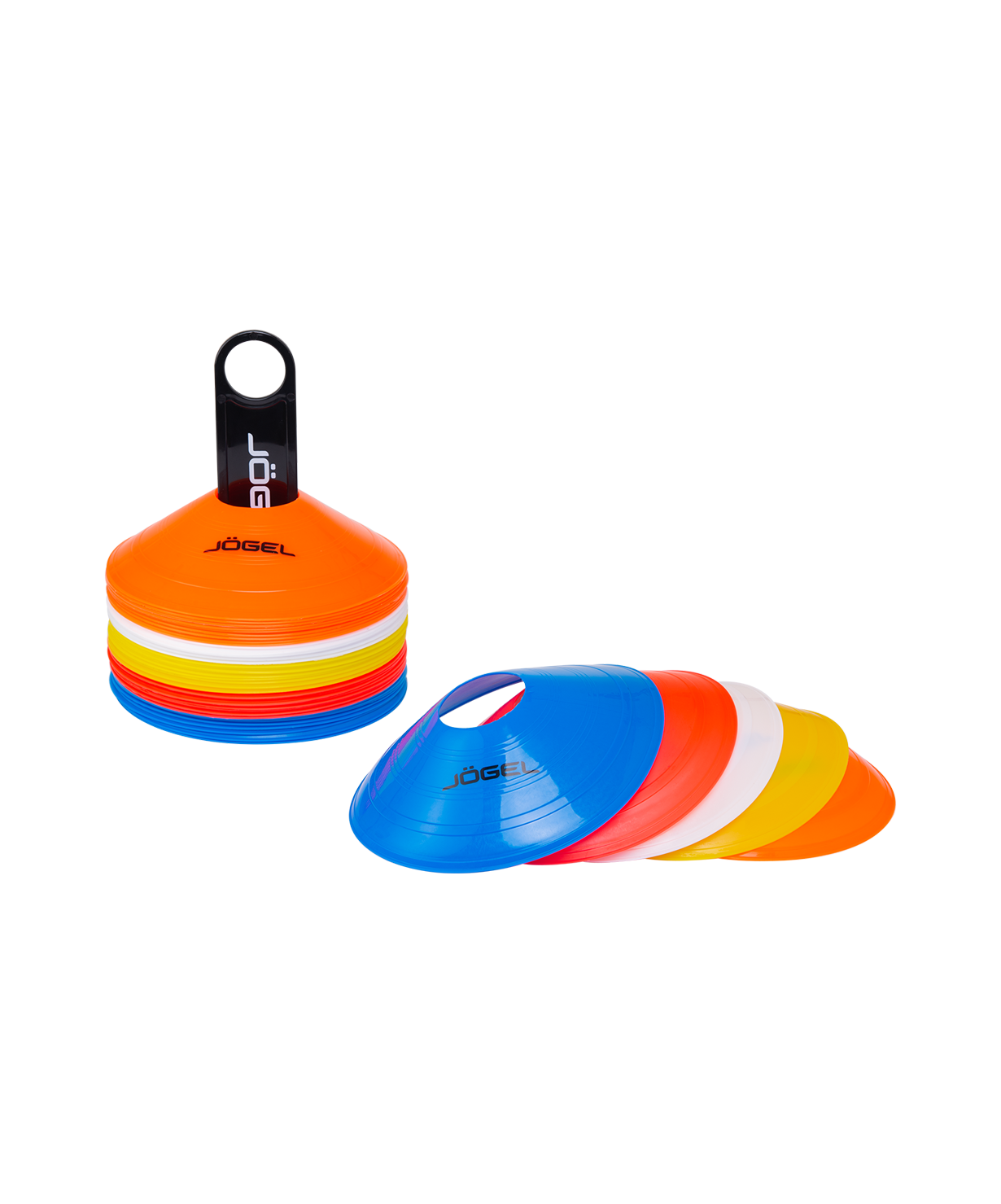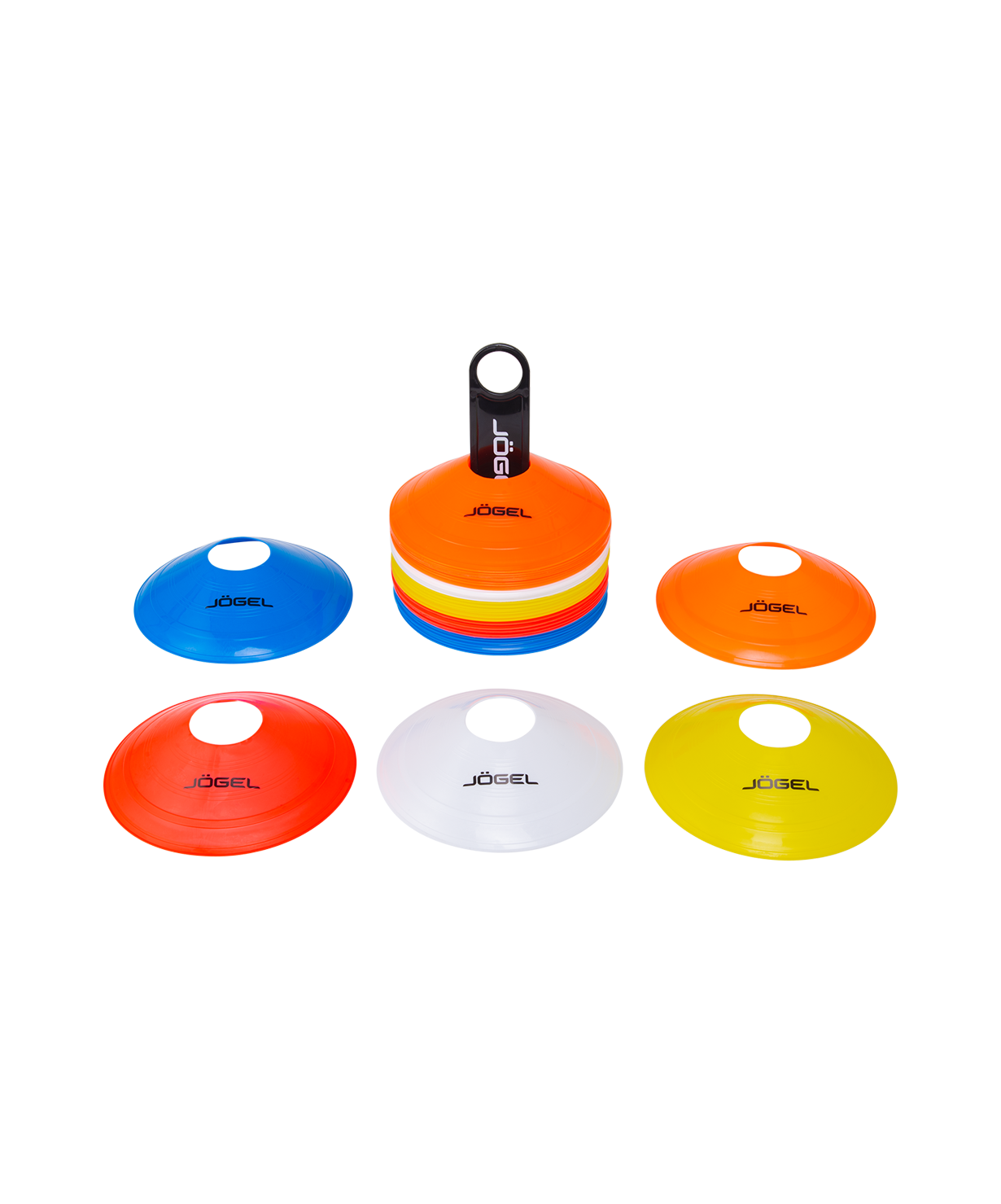 Набор из 50 ярких фишек разных цветов для разграничения пространства во время тренировочного процесса. Выполнены из мягкого, но прочного пластика. Низкий профиль обеспечивает безопасный контакт с фишками. Хорошо держат форму, быстро восстанавливаются после деформации. В комплекте держатель.\nХарактеристики:\nМатериал: полиэтилен\nЦвет: красный/желтый/оранжевый/синий/белый\nВес, г: 1280\nВысота фишки, см: 4\nДиаметр фишки, см: 19\nГабариты, см: 8,5 х 8,5 х 20,5\nКоличество в упаковке, шт: 50
