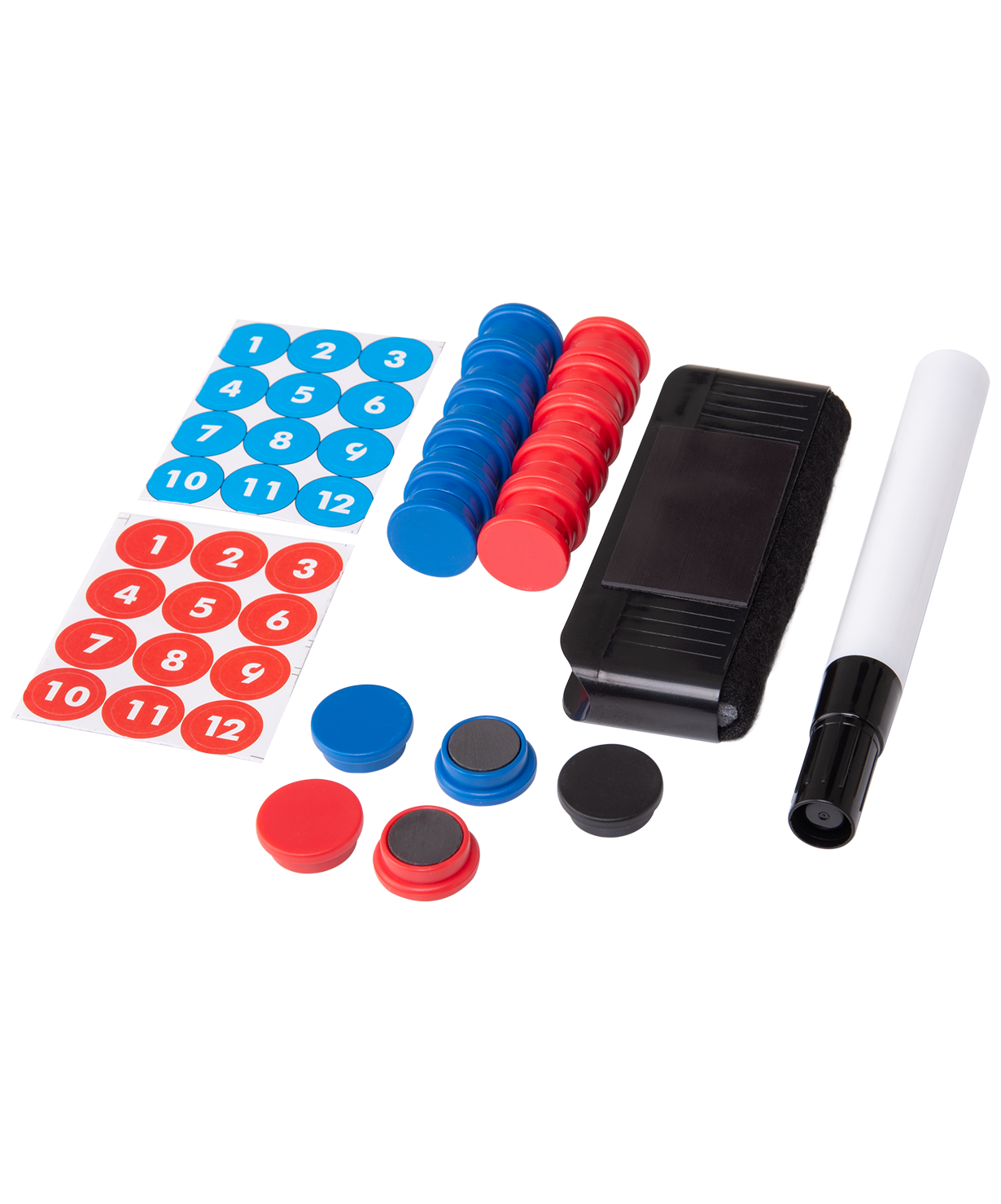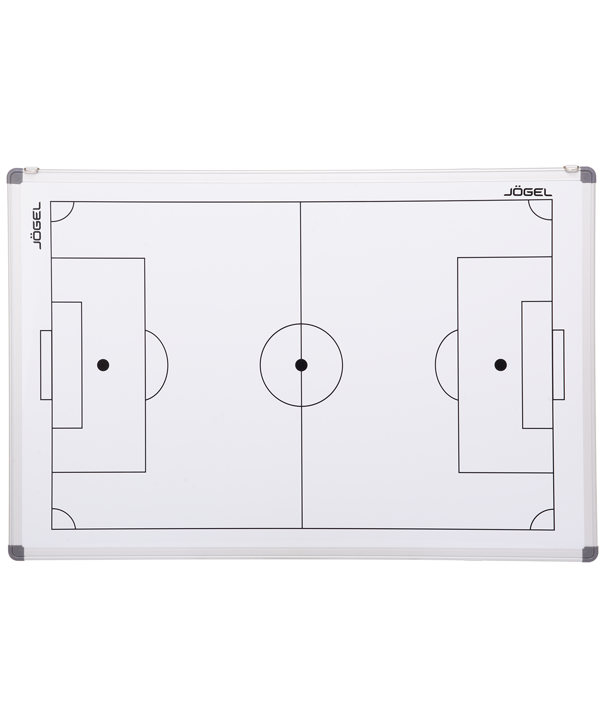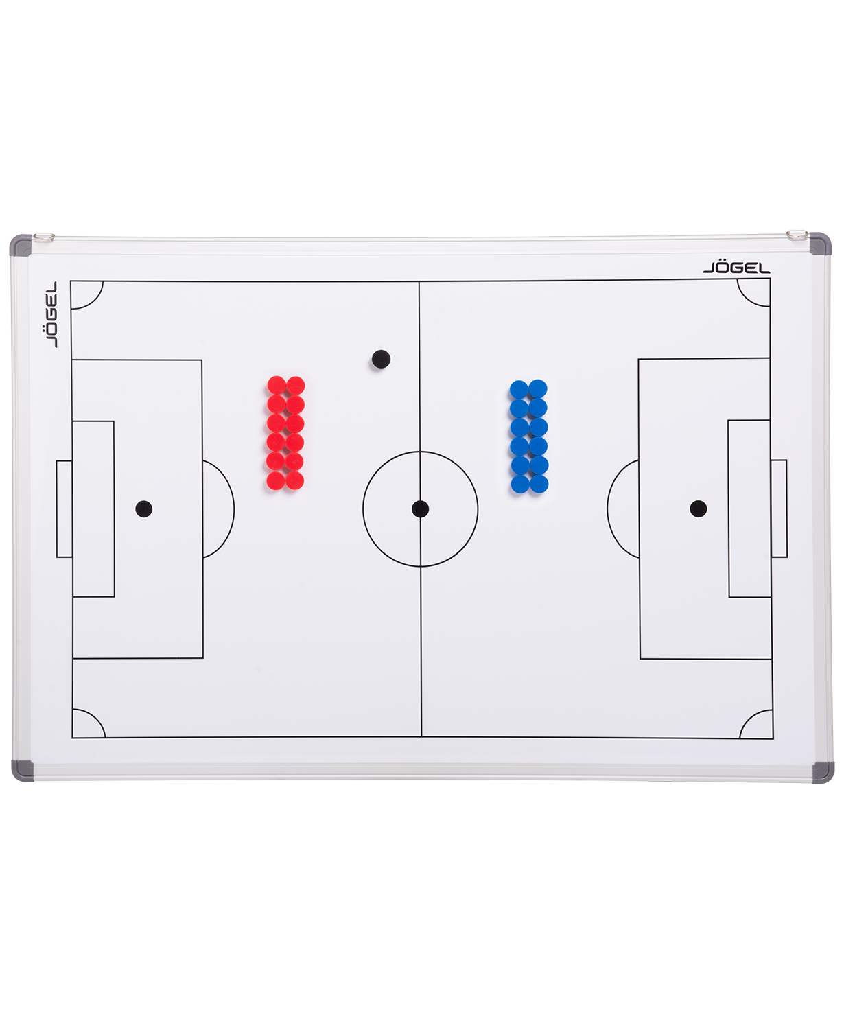 Магнитно-маркерная тактическая доска Jögel для футбола позволит тренеру разработать схему и тактику игры. Для удобства установки предусмотрены металлические петли для крепления к стене. В комплект также входят пронумерованные фишки разных цветов, маркер и губка для стирания.\nПреимущества:\n12 фишек красного цвета;\n12 фишек синего цвета;\n1 фишка черного цвета;\nМаркер;\nГубка для стирания;\nМеталлические петли для крепления.\nХарактеристики:\nМатериал: сплав металла, картон\nКомплектация: пронумерованные фишки синего, красного и черного цвета, маркер, губка для стирания\nГабариты, см: 91,5 х 3 х 61,5\nВес, г: 2600