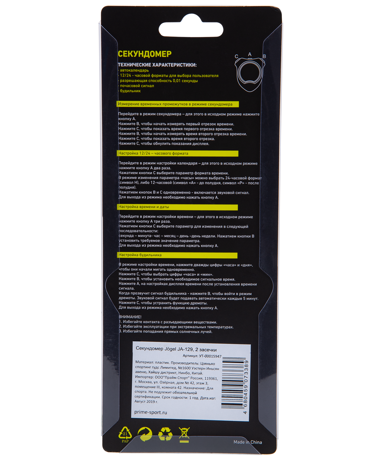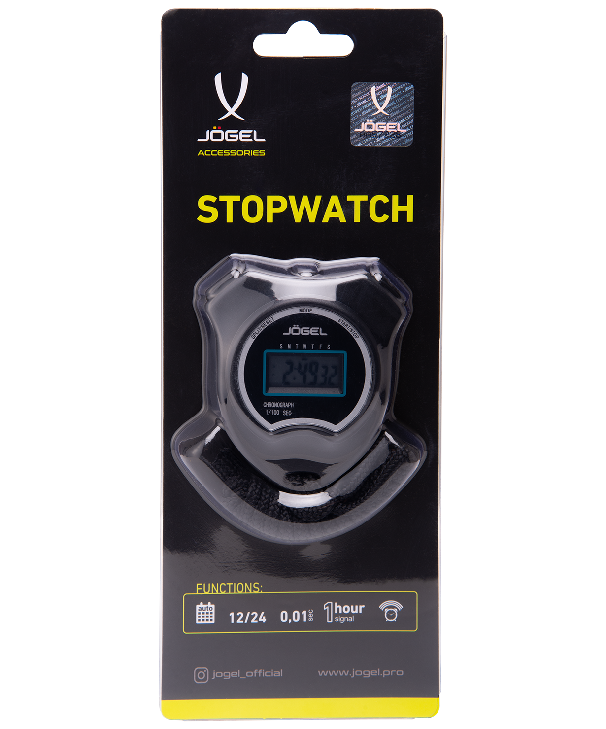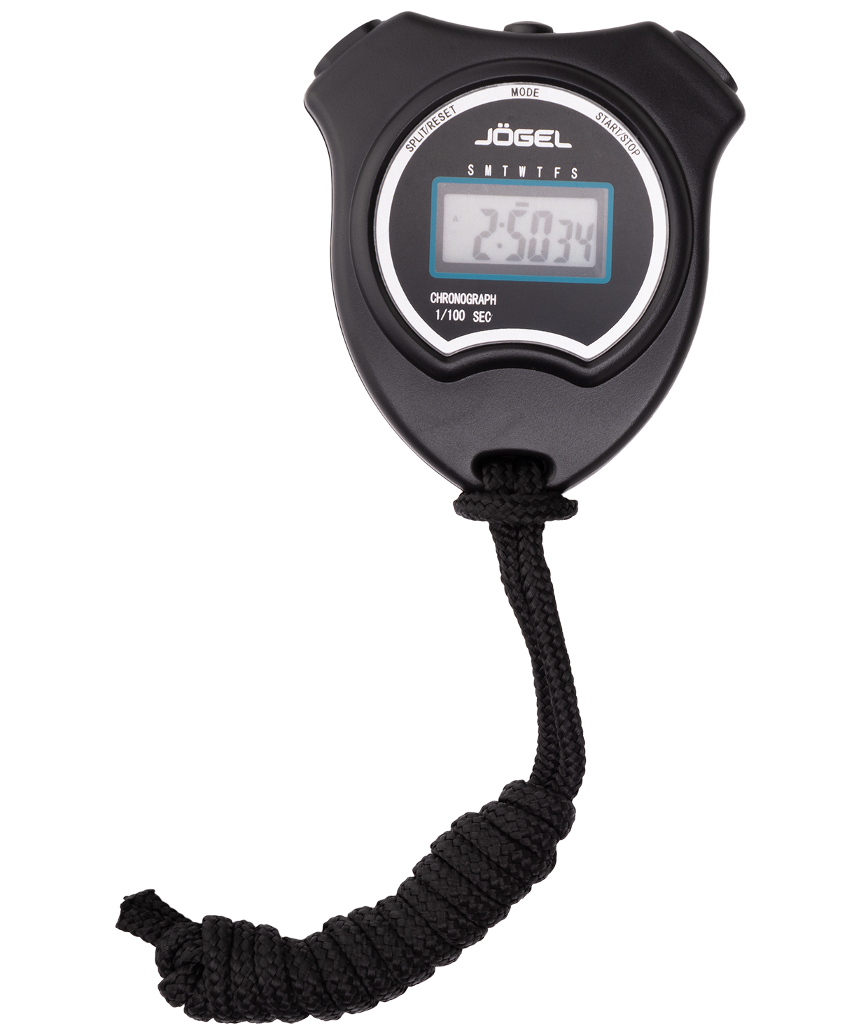 Электронный секундомер Jögel предназначен для измерения времени (результата) спортсмена на тренировках и соревнованиях по различным видам спорта. Модель имеет все необходимые функции. Допустимая погрешность измерения: 0,6 сек. В комплекте идет удобный прочный шнурок для крепления на шее и инструкция по эксплуатации. Секундомер поставляется с батарейкой.\nПреимущества:\nИзмерение в минутах, секундах и сотых долях секунд;\nПамять на 2 результата;\nВремя и дата в формате 12/24 ч;\nБудильник;\nПочасовой сигнал;\nНе сбрасывается установленная дата после выключения.\nХарактеристики:\nМатериал: пластик\nЦвет: черный\nКомплектация: секундомер, шнурок, инструкция\nВес, г: 55\nТип упаковки: блистер