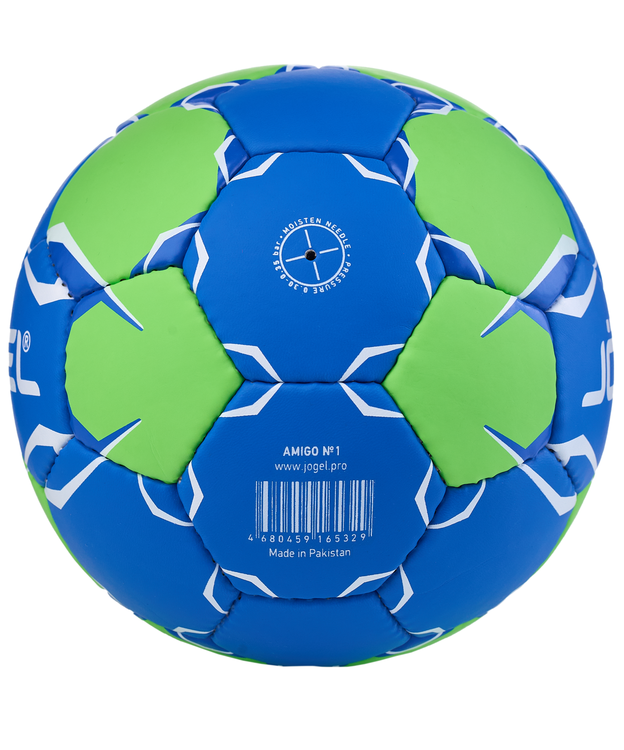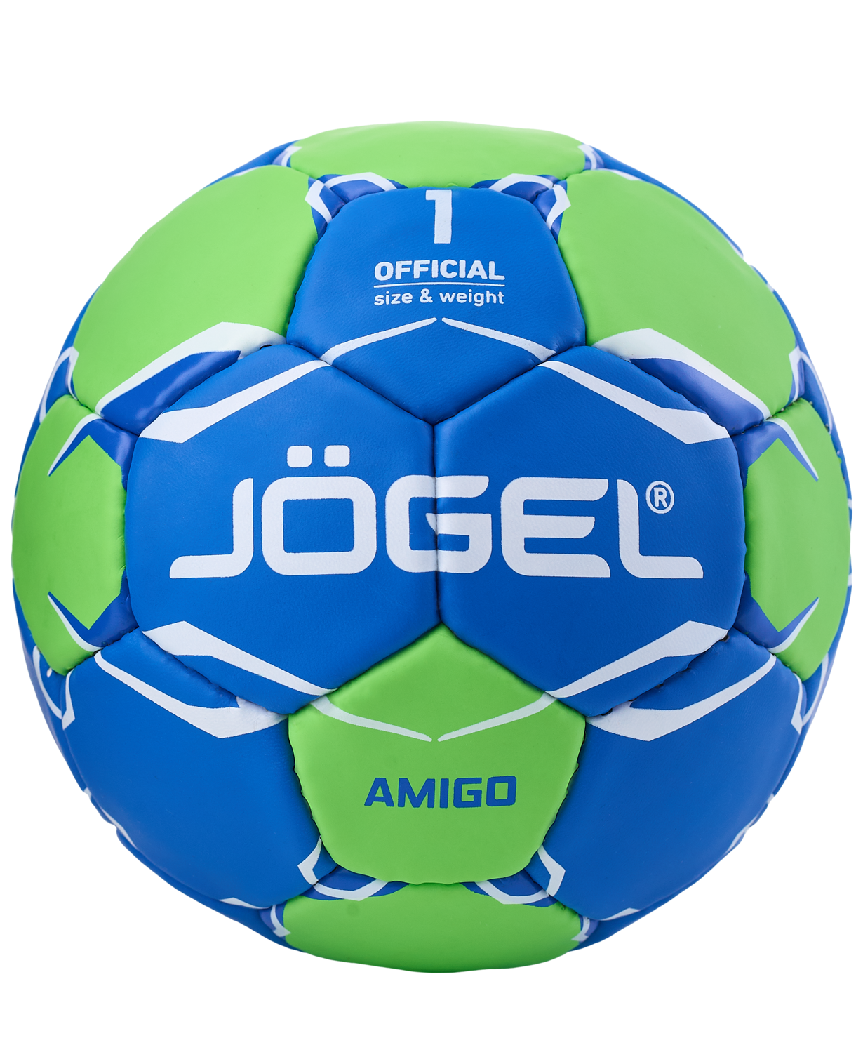 Категория: Тренировочный\nМяч Amigo от Jögel –это отличное решение для тренировок команд начального уровня. Данная модель обладает хорошими игровыми и прочностными характеристиками. Выполнен по технологии ручной сшивки, благодаря чему мяч износостойкий и упругий, а давление в мяче распределяется равномерно. Поверхность мяча выполнена из синтетической кожи (полиуретан) толщиной 1,1 мм + 3,0 мм подкладочный слой из специальной пены. Мяч оснащен латексной камерой с бутиловым ниппелем для правильного отскока и долгого использования снаряда без подкачки.\nРекомендован для тренировок команд начального уровня. Размер 1 - для женских команд (8-14 лет) и мужских (8-12 лет). Официальный размер и вес EHF.\nВнимание: Данный мяч поставляется с завода-изготовителя в спущенном состоянии для безопасной транспортировки и хранения. Рекомендуем приобрести насос и иглу для накачки мяча.\nХарактеристики:\nРекомендованные покрытия: паркет\nМатериал поверхности: 1.1 мм синтетическая кожа (полиуретан)\nПодкладочный слой: 4 подкладочных слоя (2 слоя хлопка и 2 слоя вискозы)\nМатериал камеры: латекс\nТип соединения камеры: ручная сшивка\nКоличество панелей: 32\nРазмер: 1\nВес, г: 290-330\nДлина окружности, см: 50-52\nРекомендованное давление: 0.30-0.35 bar\nМяч поставляется: спущенный\nОсновной цвет: синий\nДополнительный цвет: зеленый\nПроизводство: Пакистан