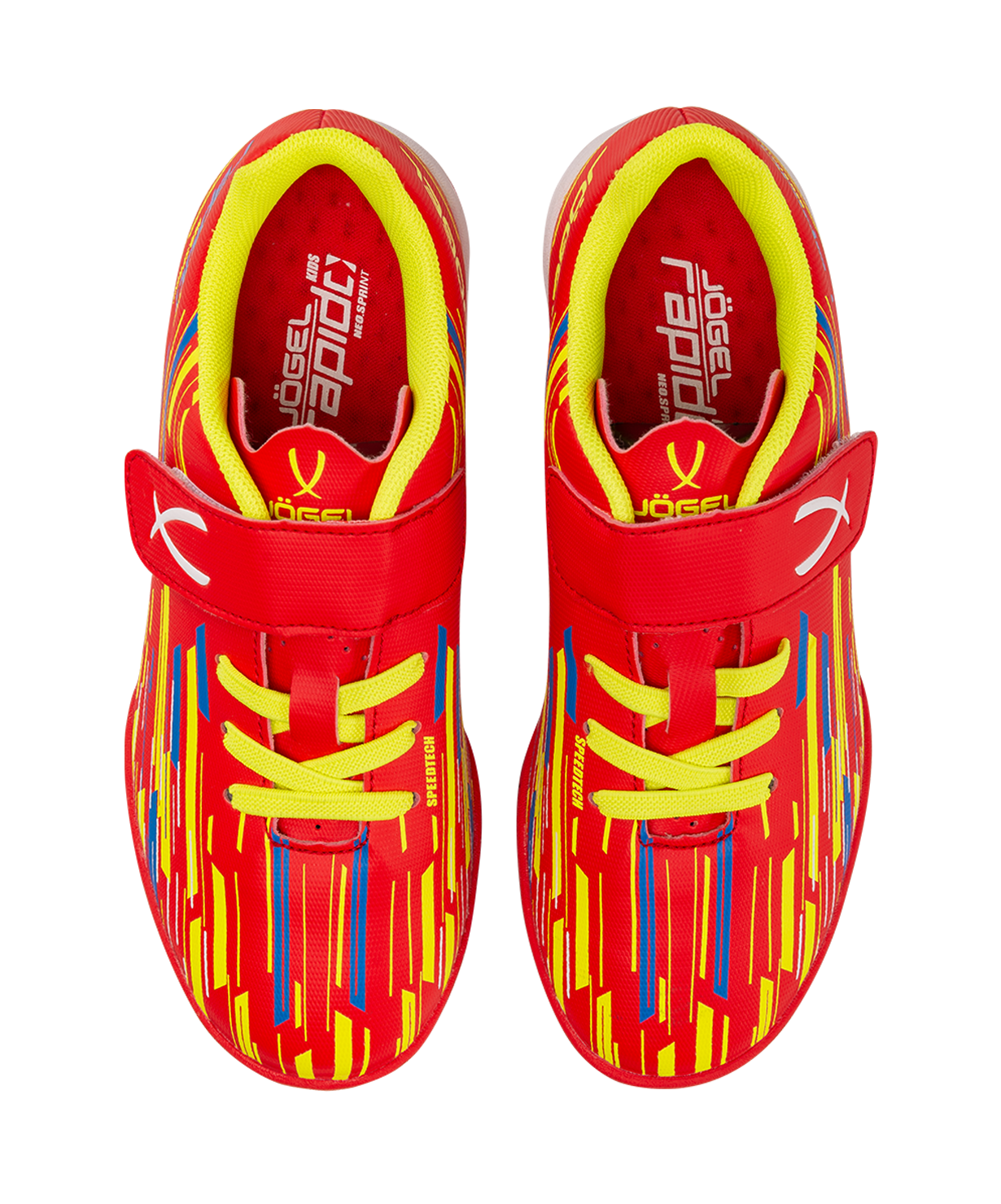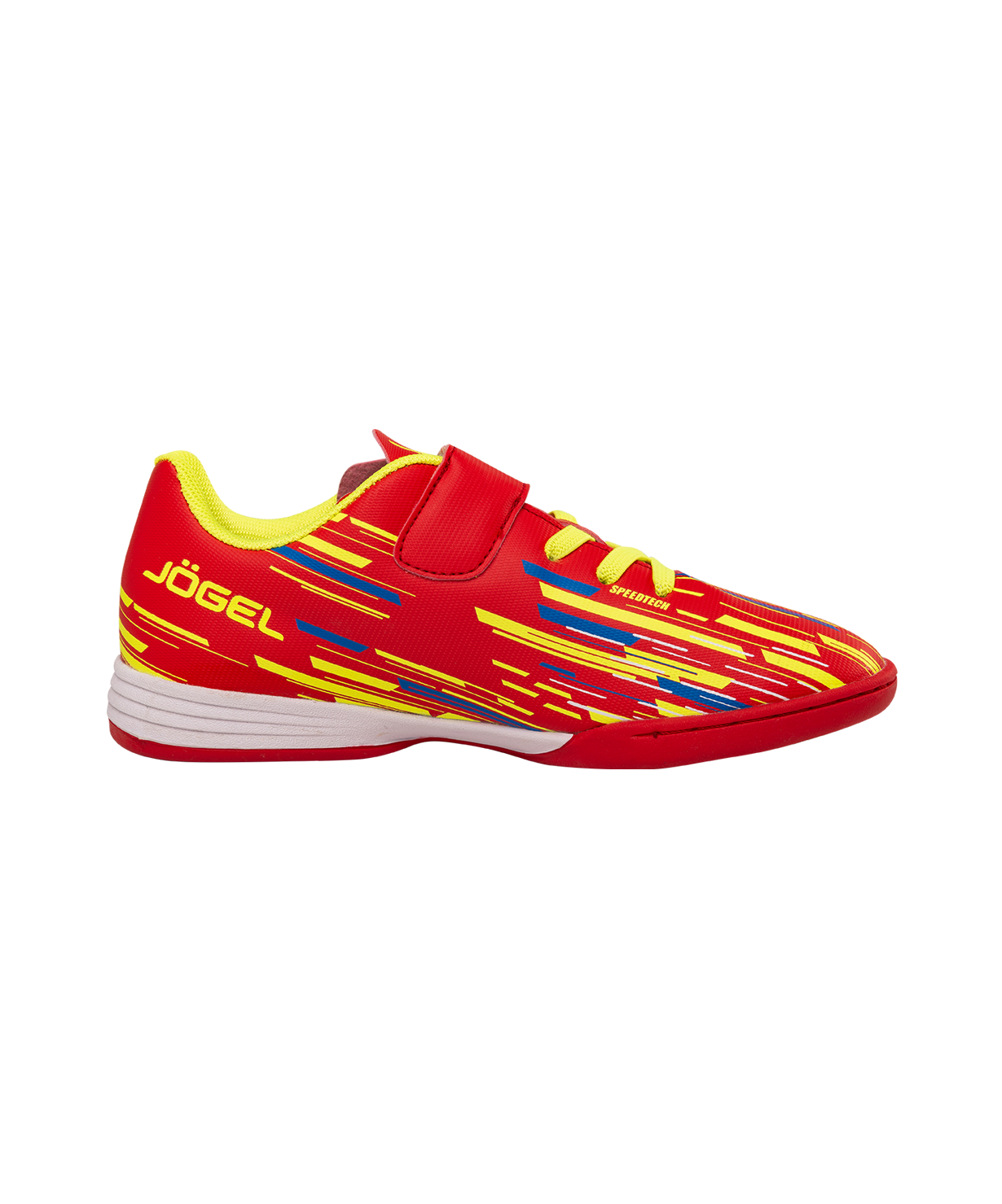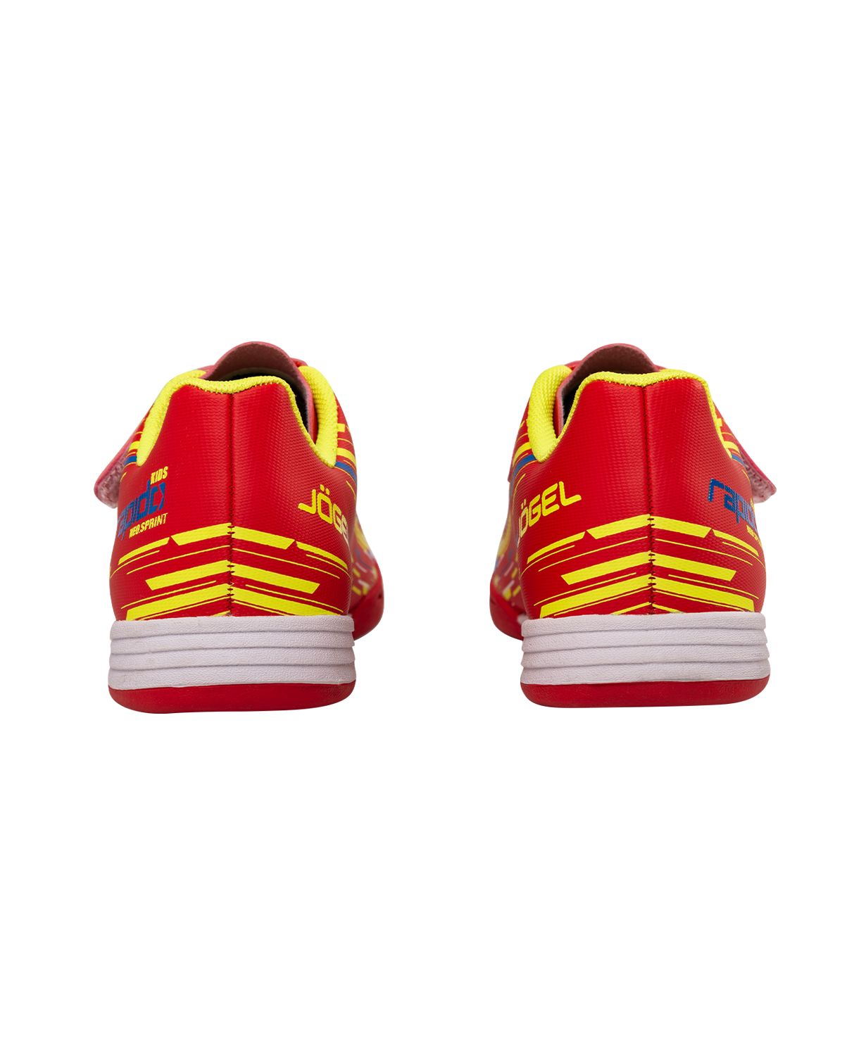 Новое поколение детской модели Rapido Kids из линейки neo.Sprint. Бутсы отлично подходят для зала, для игры на любых ровных поверхностях и даже для повседневной носки. Они стали практичнее, комфортнее и технологичнее.\nВ Rapido Kids используется технология Speedtech для максимальной скорости на поле. Новая форма анатомической колодки для еще более правильного положения стопы. Носочная часть усилена дополнительной прошивкой. Мягкая стелька из материала ЭВА смягчает нагрузку и обеспечивает необходимый комфорт. Улучшенный механизм липучки и не требующие завязки резиновые шнурки - теперь надевание будет еще быстрее и удобнее. Для обеспечения дополнительного вентилирования в язычке сделаны специальные отверстия. Подошва обуви выполнена по технологии Non-marking, что обеспечивает безупречное сцепление с поверхностями, обувь не оставляет следов на паркете.\nВ производстве обуви Jögel используются только качественные материалы, обувь легко моется и не требует дополнительного ухода.\nТехнология Speedtech - соединение облегченных материалов и динамичной конструкции бутсы, что позволяет футболисту раскрыть свои скоростные способности.\nМатериал верха:Полиуретан\nМатериал подкладки обуви:Текстиль\nМатериал подошвы обуви:Резина\nМатериал стельки: ЭВА, текстиль\nПолнота обуви: D\nРазмерный ряд: 28-33 (RU)\nВид застежки: Липучка и фиксированные резиновые шнурки\nТип подошвы: Зальная\nОсновной цвет: Красный\nДополнительные цвета: Желтый/синий\nНазначение обуви: Спорт, футбол, повседневная\nРекомендованные покрытия: паркет, ровные твердые поверхности\nСезон: Демисезон\nПол: Унисекс\nСтрана производитель: КНР\nКомплектация: Бутсы, коробка\nТаблица размеров: