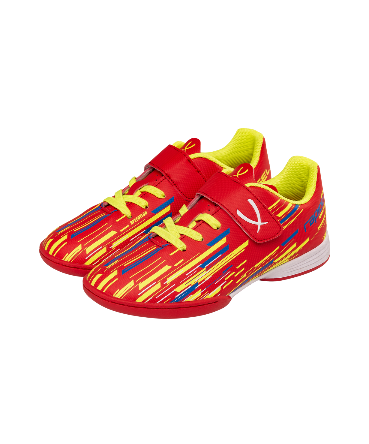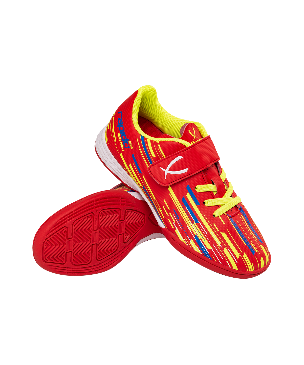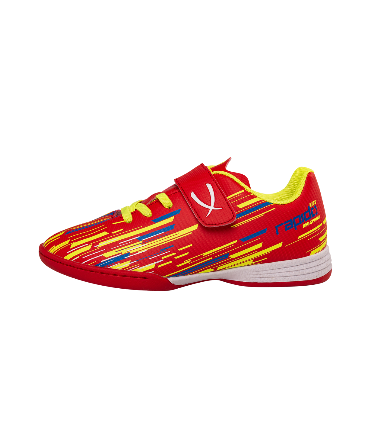 Новое поколение детской модели Rapido Kids из линейки neo.Sprint. Бутсы отлично подходят для зала, для игры на любых ровных поверхностях и даже для повседневной носки. Они стали практичнее, комфортнее и технологичнее.\nВ Rapido Kids используется технология Speedtech для максимальной скорости на поле. Новая форма анатомической колодки для еще более правильного положения стопы. Носочная часть усилена дополнительной прошивкой. Мягкая стелька из материала ЭВА смягчает нагрузку и обеспечивает необходимый комфорт. Улучшенный механизм липучки и не требующие завязки резиновые шнурки - теперь надевание будет еще быстрее и удобнее. Для обеспечения дополнительного вентилирования в язычке сделаны специальные отверстия. Подошва обуви выполнена по технологии Non-marking, что обеспечивает безупречное сцепление с поверхностями, обувь не оставляет следов на паркете.\nВ производстве обуви Jögel используются только качественные материалы, обувь легко моется и не требует дополнительного ухода.\nТехнология Speedtech - соединение облегченных материалов и динамичной конструкции бутсы, что позволяет футболисту раскрыть свои скоростные способности.\nМатериал верха:Полиуретан\nМатериал подкладки обуви:Текстиль\nМатериал подошвы обуви:Резина\nМатериал стельки: ЭВА, текстиль\nПолнота обуви: D\nРазмерный ряд: 28-33 (RU)\nВид застежки: Липучка и фиксированные резиновые шнурки\nТип подошвы: Зальная\nОсновной цвет: Красный\nДополнительные цвета: Желтый/синий\nНазначение обуви: Спорт, футбол, повседневная\nРекомендованные покрытия: паркет, ровные твердые поверхности\nСезон: Демисезон\nПол: Унисекс\nСтрана производитель: КНР\nКомплектация: Бутсы, коробка\nТаблица размеров: