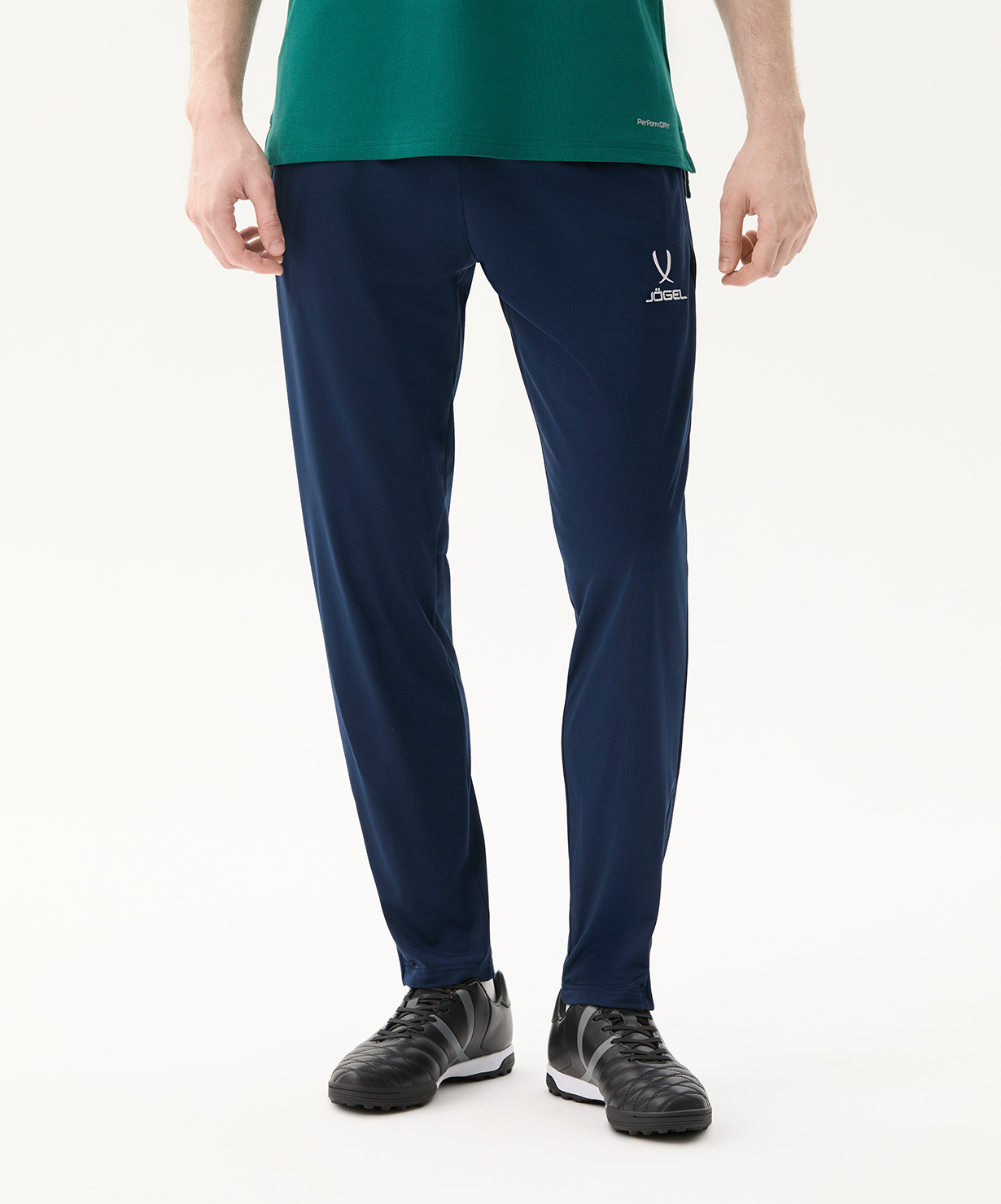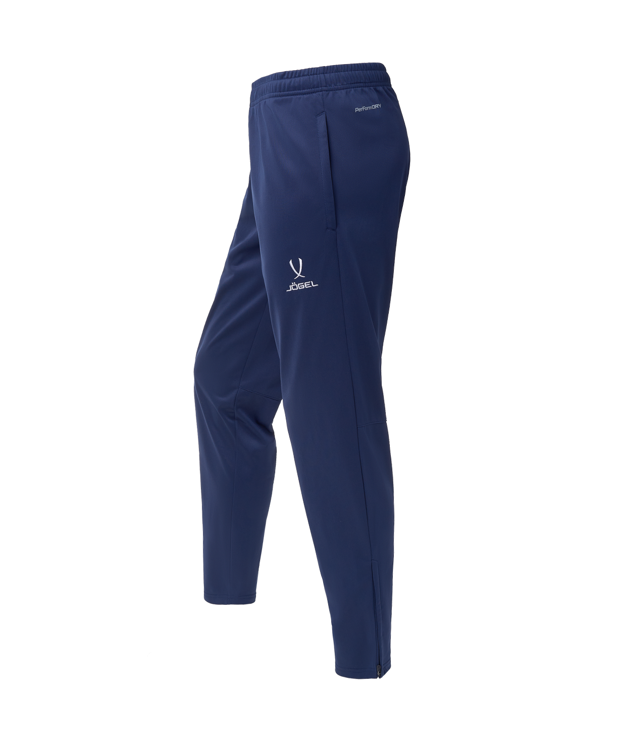 Высокотехнологичные спортивные брюки для профессионалов и любителей, актуальные для регулярного использования при занятиях спортом и повседневного использования. Модель свободно сидит по всей длине и умеренно прилегает в области щиколотки, формируя атлетический силуэт. Бондированная ткань, специально разработанная для данной линейки, состоит из нескольких слоев и дополнена функцией PerFormDRY, придавая достаточную плотность, но сохраняя мягкость и легкость брюк. Технологичное решение, расположенное сзади под коленом, способствует наилучшей посадке и большей амплитуде движений. Эластичный пояс надежно фиксирует изделие на бедрах при помощи завязок-шнурков. В нижней части штанины спортивных брюк расположен узнаваемый логотип JÖGEL и молнии, которые перекликаются с замками на карманах. Эластичный пояс с дополнительной регулировкой шнуром обеспечивает комфорт для любого типа телосложения. Спортивные брюки идеально сочетаются с олимпийкой JÖGEL DIVISION PerFormDRY Pre-match Knit Jacket.\nPerFormDRY - специальная технология обработки тканей JÖGEL, которая способствует быстрому выведению влаги и помогает спортсменам чувствовать себя комфортно при интенсивных нагрузках.\nПреимущества:\nМатериал с технологией PerFormDRY;\nАтлетический крой;\nСпециально разработанная бондированная ткань.\nХарактеристики:\nСостав: 100% полиэстер (бондированная ткань с технологией PerFormDRY)\nЦвет: темно-синий\nРазмер: S, M, L, XL, XXL, XXXL\nВид упаковки: пакет зиплок с картонной этикеткой и стикером\nСтрана производства: Китай