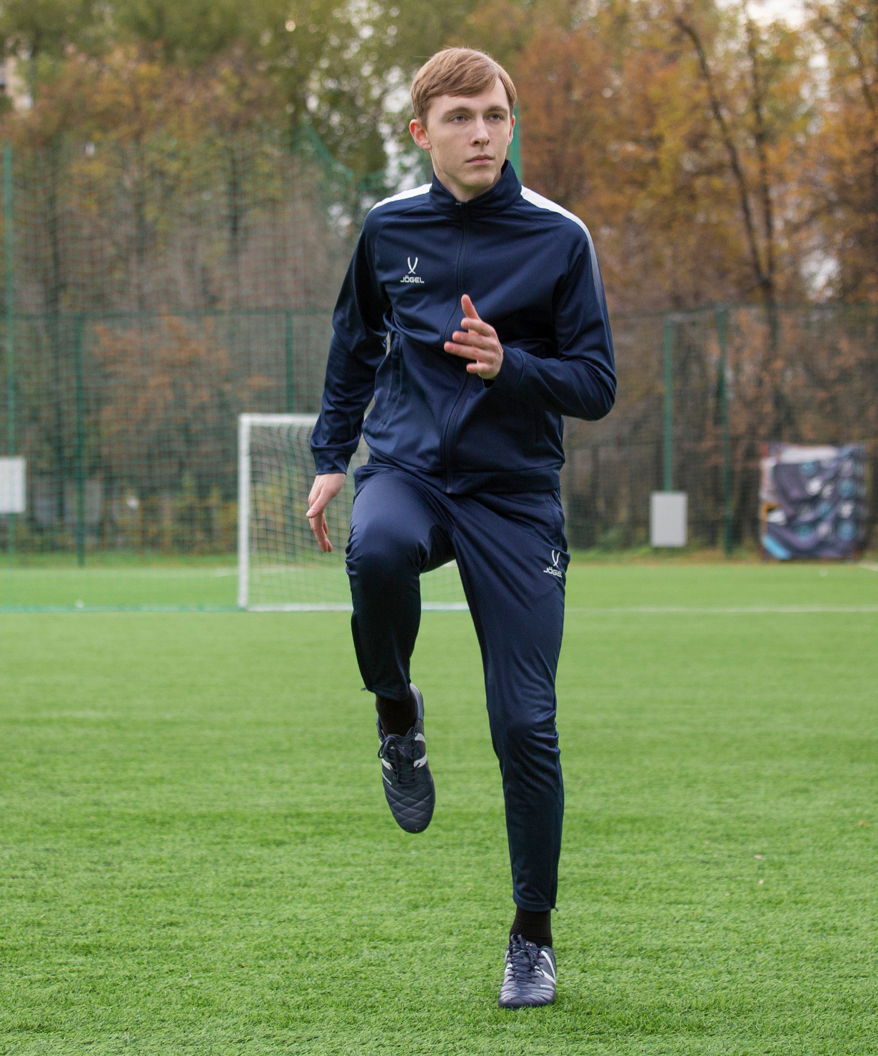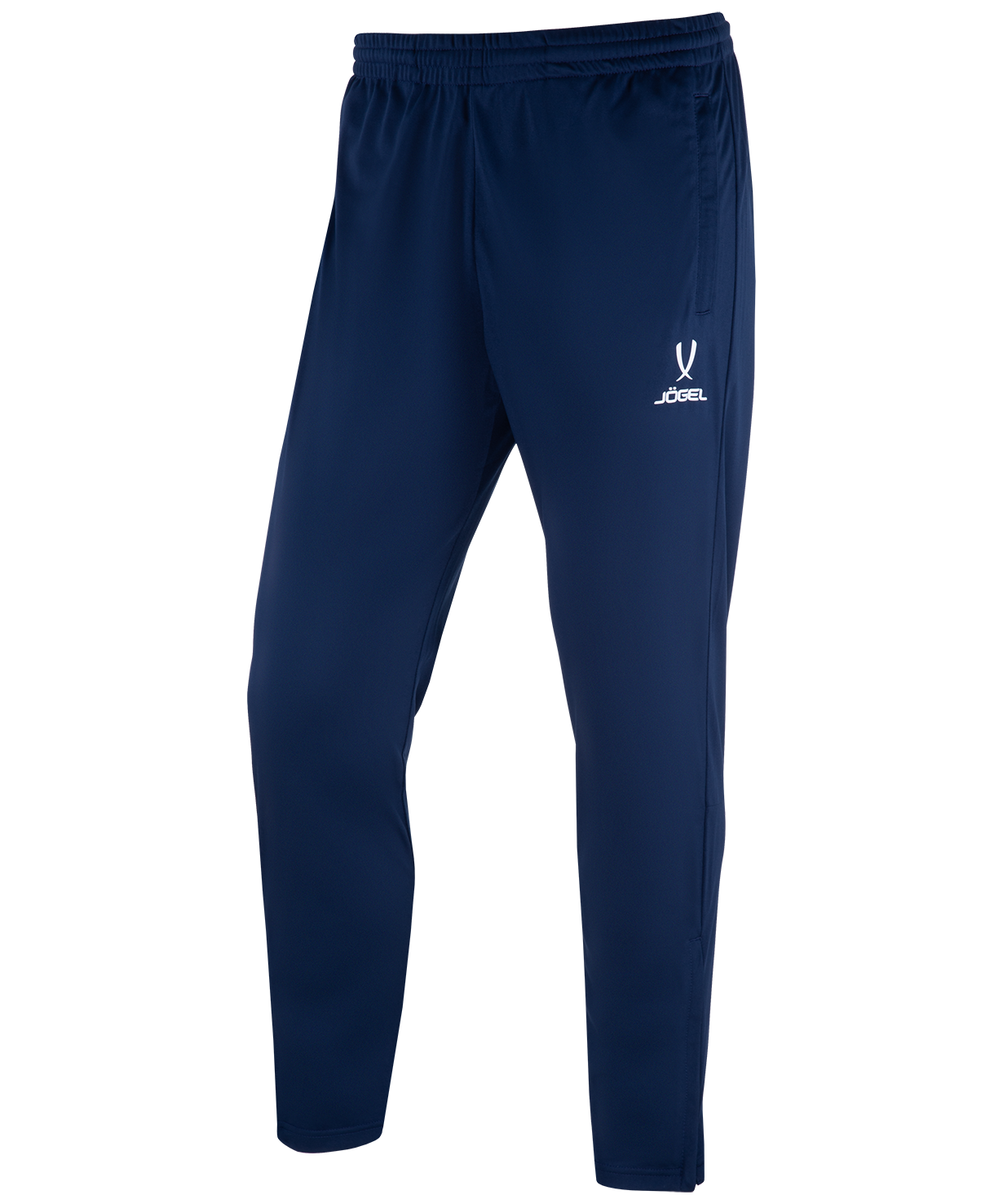 Тренировочные брюки атлетического кроя предназначены для занятий спортом и повседневной носки. Модель изготовлена из легкого и мягкого на ощупь полиэстера. Материал брюк хорошо сохраняет форму при носке и не садится при стирке, он неприхотлив в уходе, а благодаря способу переплетения хорошо тянется и садится по фигуре. Дополнительный комфорт обеспечивают 2 боковых кармана и пояс, регулируемый шнуром. Для свободы движений в районе колена предусмотрен специальный анатомический разрез, снизу расположены застежки-молнии, позволяющие регулировать ширину штанины. Крой - Tapered Fit (заужение от колена книзу). Брюки идеально подходят для интенсивных тренировок.\nБрюки удачно сочетаются с тренировочным джемпером Jögel CAMP Training Top 1/4 Zip и олимпийкой Jögel CAMP Training Jacket FZ.\nПреимущества:\nАнатомический крой в районе колена для свободы движений;\nЗауженный книзу крой;\nTapered Fit.\nХарактеристики:\nТкань: 100% полиэстер\nЦвет: темно-синий\nРазмеры: S, M, L, XL, XXL, XXXL\nТип упаковки: пакет с картонной этикеткой и стикером\nСтрана производства: Китай
