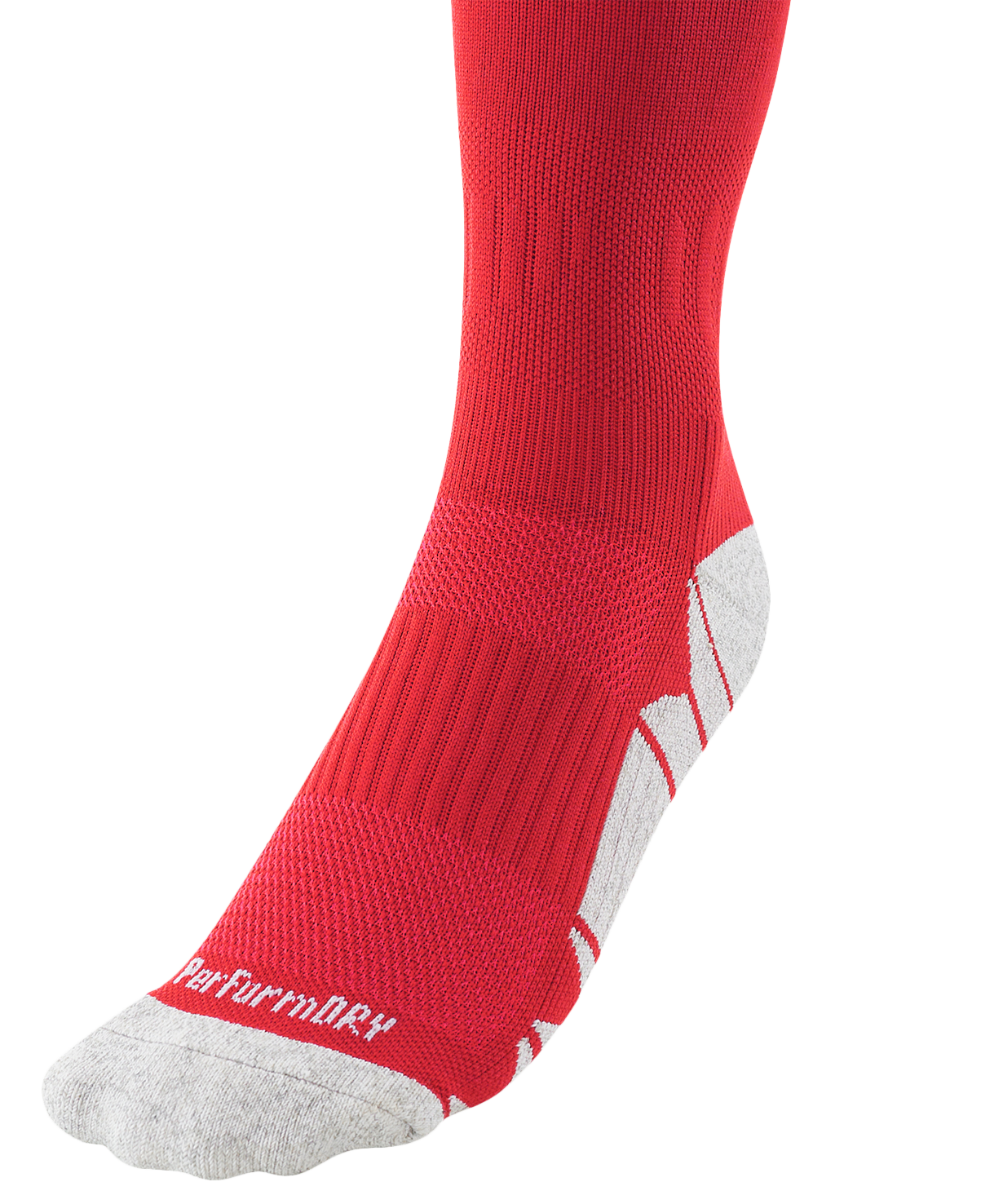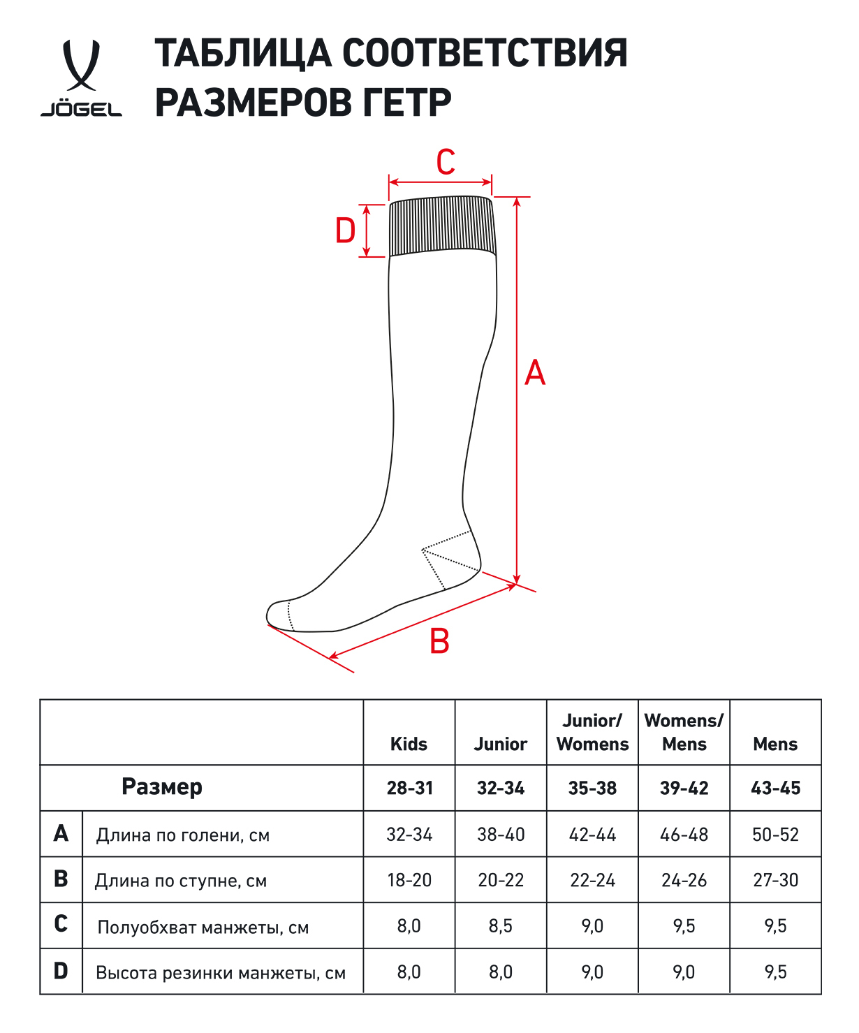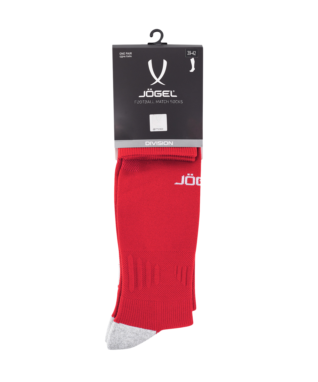 Футбольные гетры Match Socks из линейки DIVISION разработаны для команд и спортсменов высокого уровня.\nУлучшенный материал (современный трикотаж) и специальная анатомическая вязка обеспечивают поддержку свода стопы и оптимальную компрессию. А применение технологии PerFormDRY способствует быстрому выведению влаги и помогает спортсменам чувствовать себя комфортно при интенсивных нагрузках.\nСлед гетр выполнен из нескользящего материала с дополнительной амортизацией и обеспечивает надежную фиксацию стопы в обуви. Расположение сетчатых вставок гарантирует оптимальную вентиляцию и воздухообмен.\nСпециальные зоны усиления придают дополнительную амортизацию и защиту спортсмену.\nДвубортная высокая резинка удерживает спортивные гетры от сползания и позволяет носить их выше колен. На фронтальной части гетр расположен логотип бренда Jögel.\nДанная модель обладает высокой степенью комфорта, прочности и износостойкости, Match Socks идеально подойдут как профессиональным спортсменам, так и любителям.\nПреимущества:\nМатериал с технологией PerFormDRY;\nАнатомическая вязка;\nСлед из нескользящего материала;\nЗоны усиления и вентиляции.\nХарактеристики:\nСостав: нейлон 56%, хлопок 15%, полиэстер 12%, эластан 17%\nЦвет: красный\nРазмер: 35-38, 39-42, 43-45\nПроизводство: Китай