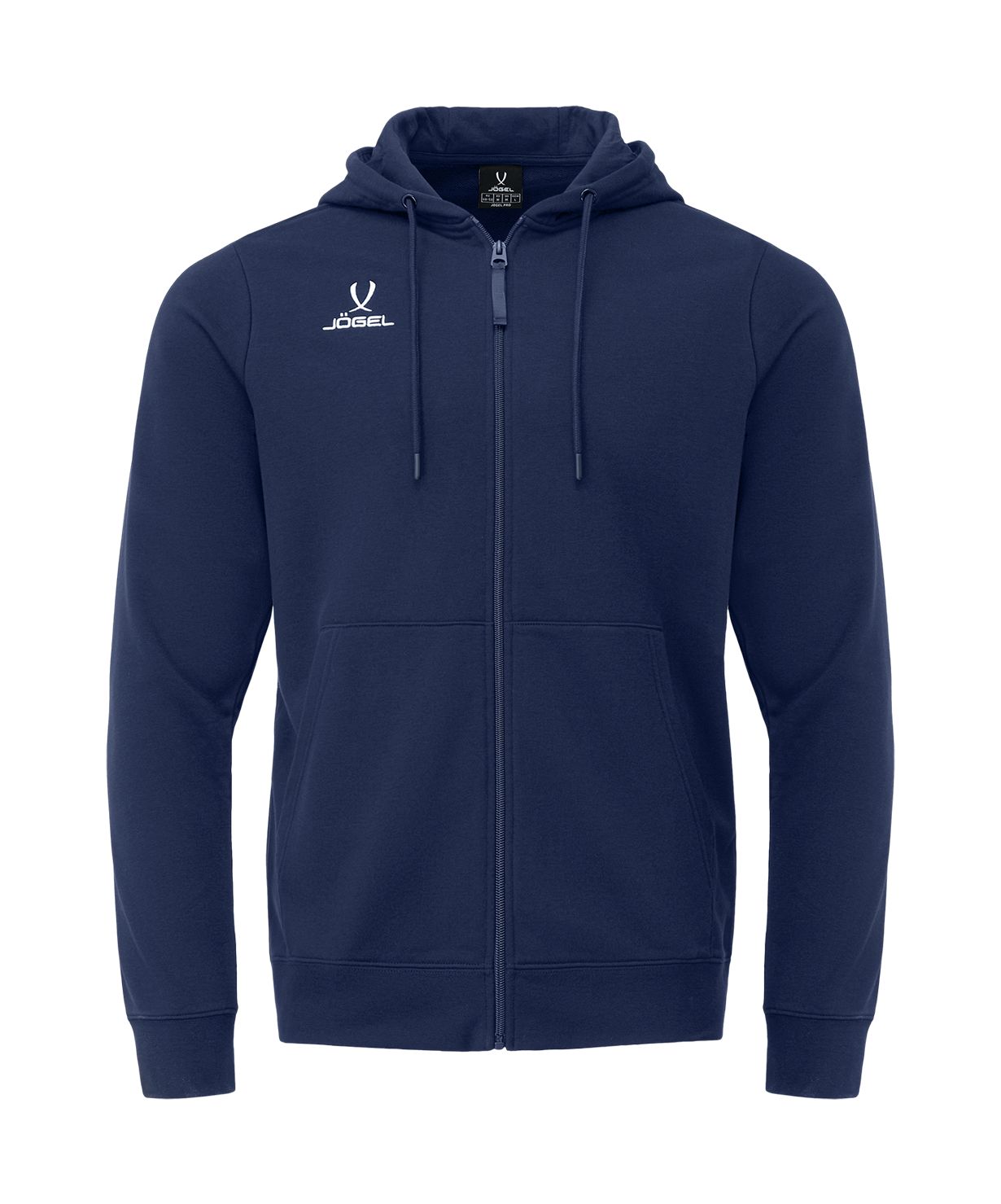 Худи с центральной застежкой-молнией — стильное решение для любых активностей и повседневной носки. Модель из износоустойчивой ткани отлично держит форму, не деформируется после стирок и не линяет. Оптимальное сочетание хлопка и полиэстера в составе обеспечивает необходимую мягкость и низкую сминаемость. Дополнительный комфорт придает петельчатая изнанка.\nХуди прекрасно подойдет для активного отдыха в теплое время года. Капюшон с регулировкой и широкие манжеты защитят от ветра, а большой удобный карман — от холода. Актуальный минималистичный дизайн удачно впишется в любой гардероб и отлично сочетается со спортивной экипировкой и одеждой Jögel.\nПреимущества:\nИзносоустойчивая ткань;\nКомфортная петельчатая изнанка;\nРегулируемый капюшон;\nУдобные манжеты;\nЗастежка-молния.\nХарактеристики:\nСостав: 70% хлопок, 30% полиэстер (French Terry-трикотажное полотно, гладкое с лицевой стороны и петельчатое с изнанки)\nЦвет: темно-синий\nРазмер: XS, S, M, L, XL, XXL, XXXL\nТип упаковки: пакет зиплок с картонной этикеткой и стикером\nСтрана производства: Китай