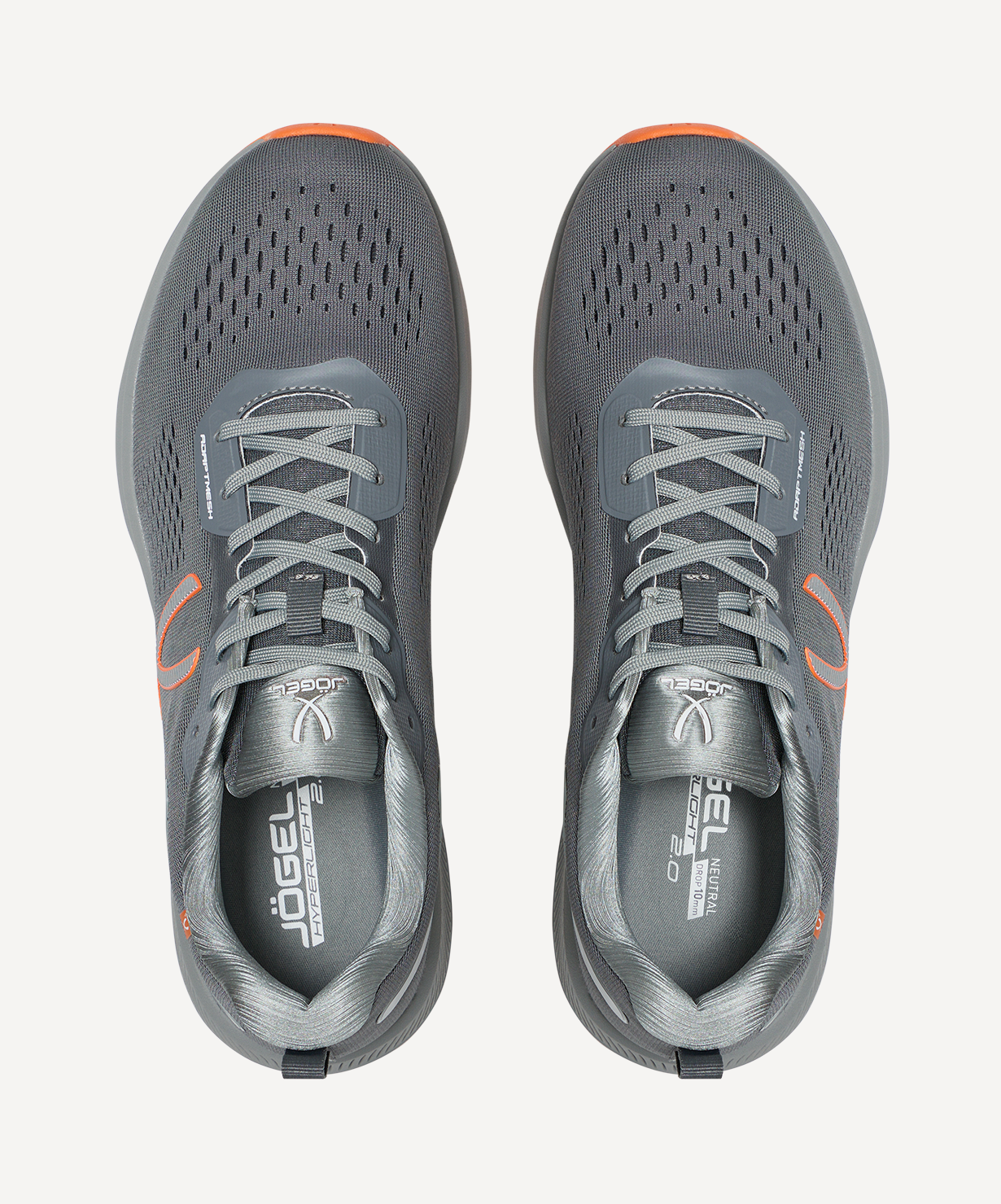 Продвинутая модель беговых кроссовок HYPERLIGHT 2.0 обеспечивает максимальный комфорт на протяжении всей тренировки. Облегченные вентилируемые материалы верха позволяют ногам не уставать во время занятий спортом, а сборка бесшовным методом с использованием пленки TPU гарантирует безупречную посадку обуви.\nФорма промежуточной подошвы из Elastlon PRO с перекатом в 10 мм отвечает за поддержку и гибкость, плавный ход и гашение ударных нагрузок во время бега. Индивидуальный дизайн резиновой подметки обеспечивает надежное сцепление с поверхностью, а наличие светоотражающих элементов делает тренировки безопаснее в вечернее время суток.\nБеговые кроссовки HYPERLIGHT 2.0 от JÖGEL – лучший вариант спортивной обуви для любителей и профессионалов.\nПреимущества:\nПродвинутая модель;\nБесшовный метод сборки деталей верха;\nОблегченные вентилируемые материалы;\nВнешний каркас (Adapt mesh) из ТПУ;\nПромежуточная подошва из Elastlon PRO;\nНадежное сцепление с поверхностью;\nСветоотражающие элементы.\nХарактеристики:\nМатериал верха: термополиуретан, текстиль\nМатериал подкладки обуви: текстиль\nМатериал подошвы обуви: эластлон про, резина\nМатериал стельки: этиленвинилацетат, текстиль\nПолнота обуви: Е\nРазмерный ряд: 36-47 (RU)\nОсновной цвет: серый\nДополнительные цвета: оранжевый\nВид застежки: шнурки\nНазначение обуви: спорт, повседневная\nКомплектация: кроссовки, коробка\nВес пары, г: 510\nТип упаковки: коробка со стикером\nСтрана производства: Китай