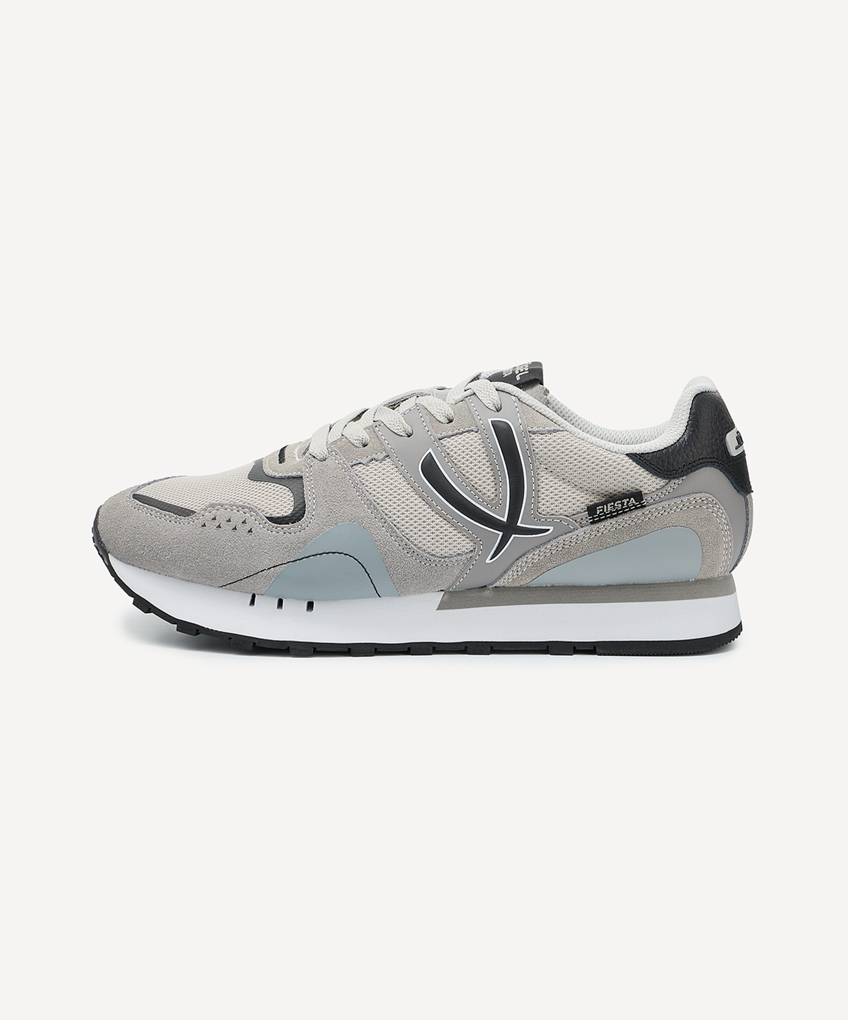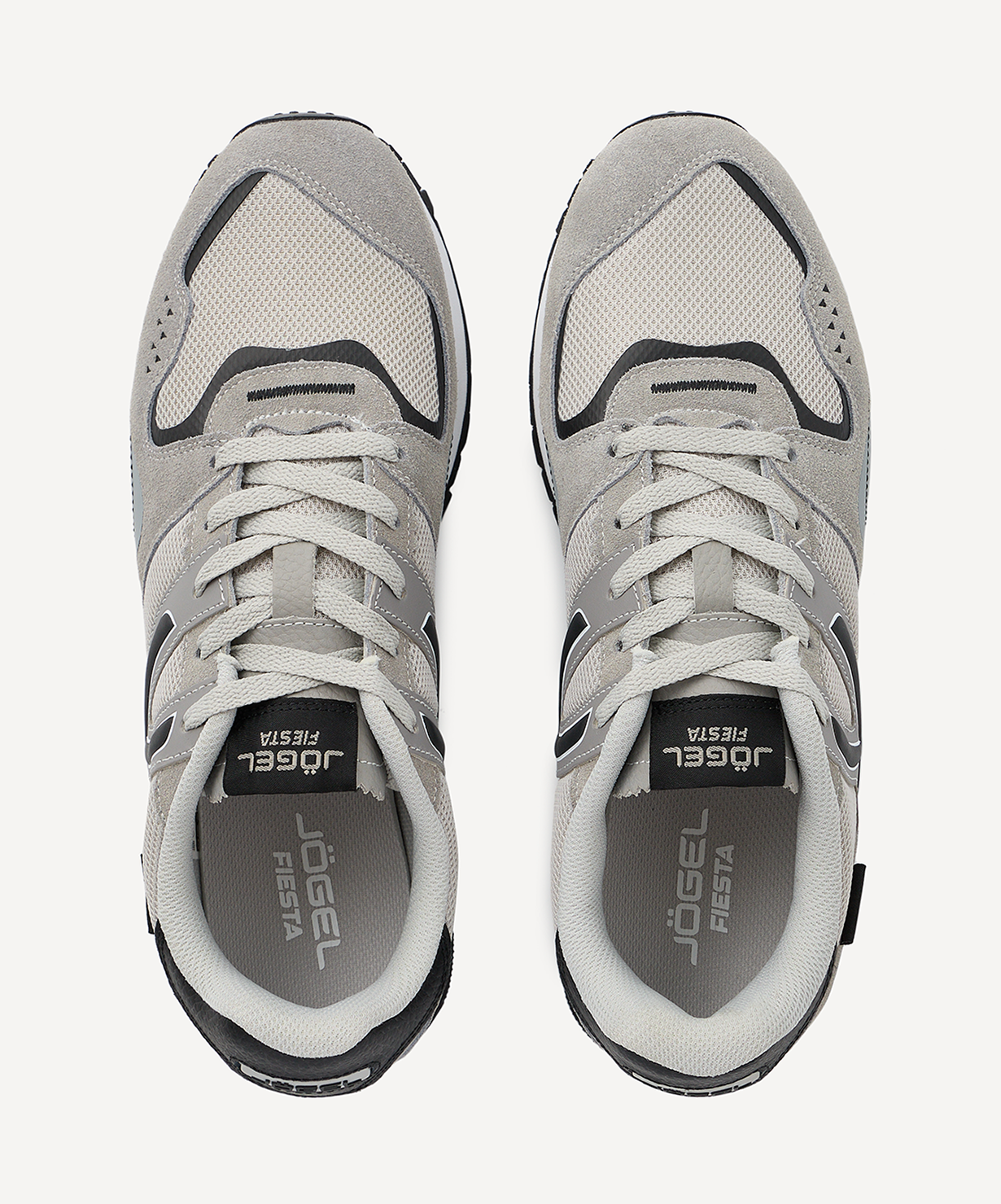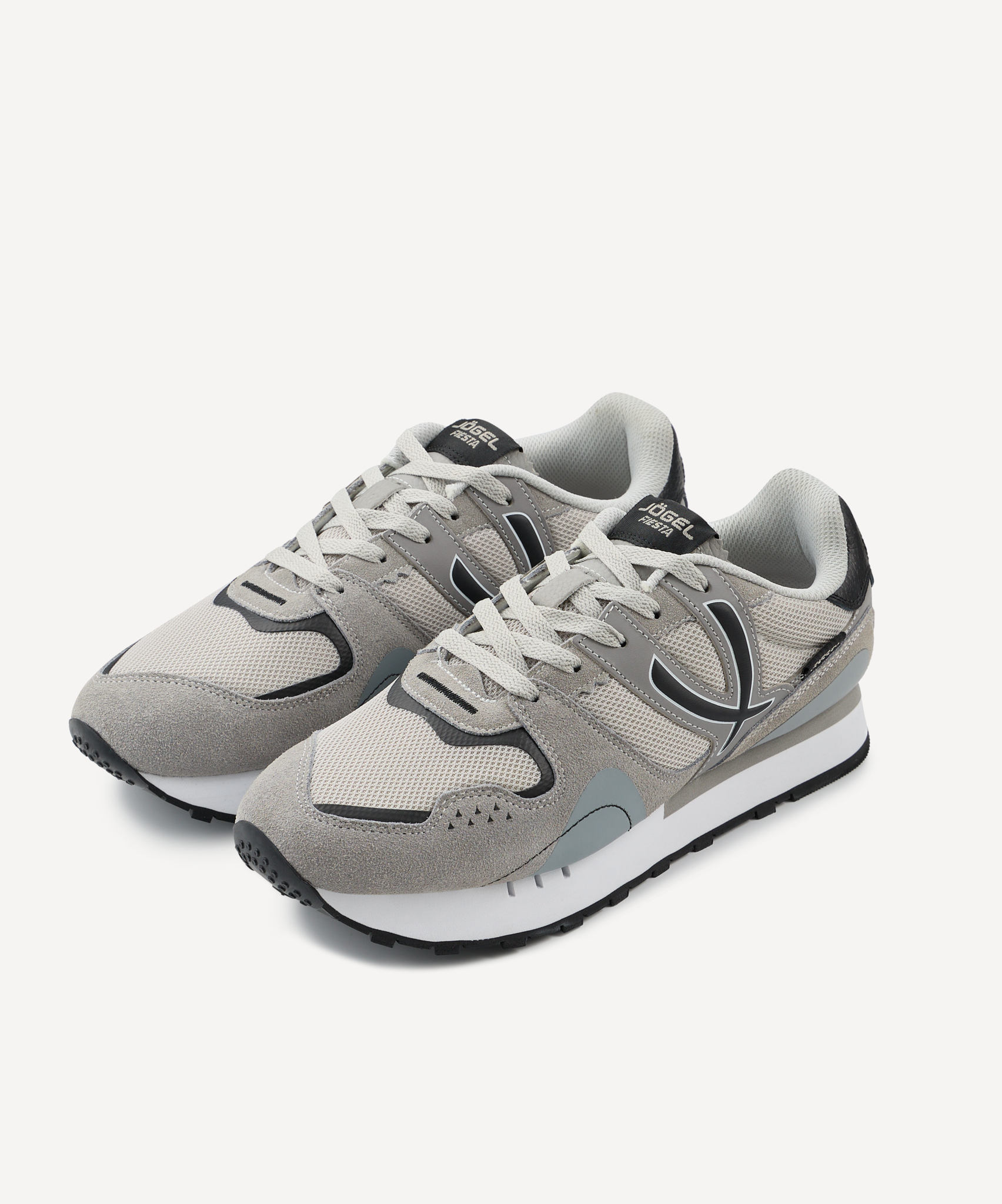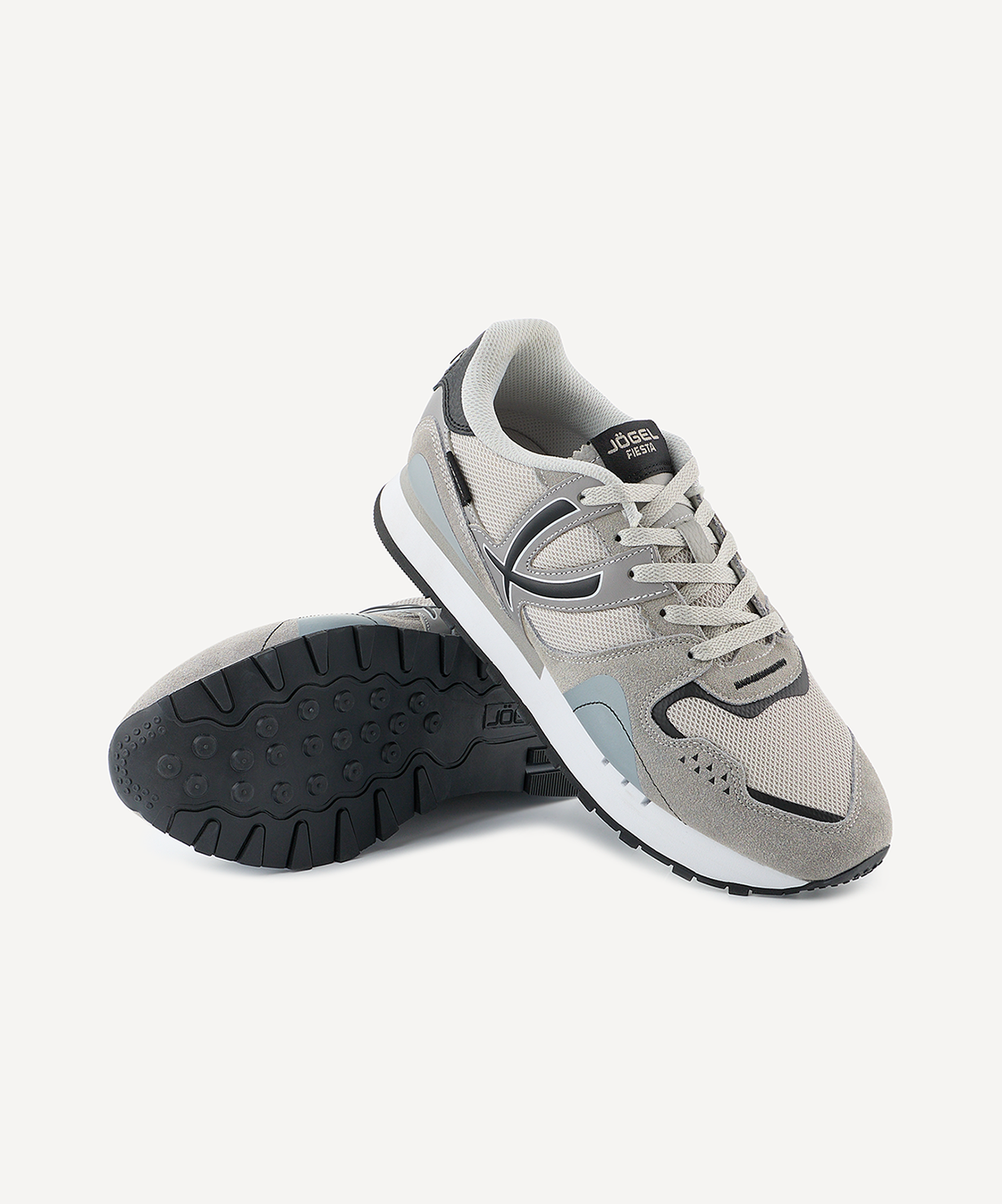 Новые цвета с полюбившихся спортивных кроссовках Fiesta от Jögel – удобная модель, которая станет находкой для любого ценителя моды и комфорта. Она отлично подходит для повседневной носки, ее можно использовать как для прогулок, так и в качестве сменной обуви на работу или учебу.\nВерх, из комбинации спилка (слоя натуральной кожи) и облегченной сетки, эффектно смотрится и прекрасно дополняет дизайн. За счет продуманной конструкции обувь обладает хорошими пароотводящими свойствами. Мягкие и легкие кроссовки дополнены износостойкой подкладкой и пружинистой подошвой из ЭВА и резины, обеспечивающей надежное сцепление с поверхностью, а стабилизатор в районе пятки, усиливает устойчивость во время движения.\nДля производства спортивной обуви Jögel используются только качественные материалы. Изделия легко моются и не требуют дополнительного ухода.\nСила внутри! А еще внутри каждой коробки с кроссовками вы найдете стильные стикеры с изображениями командных видов спорта и логотипом Jögel. Их можно наклеить на любую ровную и гладкую поверхность, добавив индивидуальности своим аксессуарам.\nПреимущества:\nЛегкая и мягкая модель;\nХорошие влагоотталкивающие свойства;\nИзносостойкая подкладка;\nПружинистая подошва из ЭВА и резины;\nСтабилизатор для лучшей устойчивости.\nХарактеристики:\nМатериал верха: спилок, текстиль, кожа экшен\nМатериал подкладки обуви: текстиль (полиэстер), полиуретан\nМатериал подошвы обуви: этиленвинилацетат, резина\nМатериал стельки: этиленвинилацетат, полиуретан\nПолнота обуви: Е\nРазмерный ряд: 36-46 (RU)\nОсновной цвет: серый\nДополнительные цвета: темно-серый\nВид застежки: шнурки\nКомплектация: кроссовки, коробка\nВес пары, г: 750\nТип упаковки: коробка со стикером\nСтрана производства: Китай