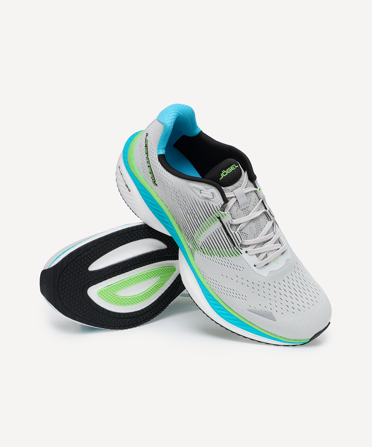Новая облегченная модель беговых кроссовок Lightray бренда JOGEL в актуальных цветовых сочетаниях – превосходный вариант для пробежек и тренировок. Спортивные кроссовки LIghtray обеспечивают максимальный комфорт на протяжении всей тренировки. Облегченные вентилируемые материалы верха c использованием сетки жаккард позволяют ногам не уставать во время занятий спортом, а сборка бесшовным методом с использованием пленки ТПУ гарантирует безупречную посадку обуви.\nФорма промежуточной подошвы из Elastlon PRO с перекатом в 10 мм отвечает за поддержку и гибкость, плавный ход и гашение ударных нагрузок во время бега. Материал во внутреннем промежуточном слое подошвы обеспечивает исключительную амортизацию, мягкость и возврат энергии (до 55-60%), оставаясь устойчивым к перепадам температур и долговечным, в отличие от традиционного ЭВА. Индивидуальный дизайн резиновой подметки обеспечивает надежное сцепление с поверхностью.\nШирокий размерный ряд (от 36 до 46) позволяет подобрать оптимальную пару как подросткам, так и взрослым.\nДышащие легкие кроссовки Lightray – лучший вариант спортивной обуви для любителей и профессионалов. В производстве обуви JOGEL используются только качественные материалы, кроссовки легко моются и не требуют дополнительного ухода.\nСила внутри! А еще внутри каждой коробки вы найдете стильные стикеры с изображениями JOGEL. Их можно наклеить на любую гладкую поверхность, добавив индивидуальности своим аксессуарам.\nПреимущества:\nПродвинутая модель;\nБесшовный метод сборки деталей верха;\nОблегченные вентилируемые материалы;\nВнешний каркас и вставки из ТПУ;\nПромежуточная подошва из Elastlon PRO;\nНадежное сцепление с поверхностью.