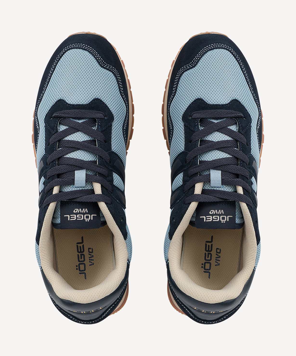 Спортивные кроссовки Vivo от Jögel – облегченная модель, которая станет прекрасным выбором для любителей качества и минимализма! Обувь Vivo идеальна для повседневной носки, она обладает необходимой легкостью и мягкостью, а дышащая сетка позволяет насладиться использованием данных кроссовок в полном объеме!\nКонструкция верха – это сочетание натурального спилка (слоя натуральной кожи) и сетки. Кроссовки дополнены качественной подкладкой и подошвой из ЭВА и резины, обеспечивающей надежное сцепление с поверхностью.\nДля производства спортивной обуви Jögel используются только качественные материалы. Изделия легко моются и не требуют дополнительного ухода.\nСила внутри! А еще внутри каждой коробки с кроссовками вы найдете стильные стикеры с изображениями командных видов спорта и логотипом Jögel. Их можно наклеить на любую ровную и гладкую поверхность, добавив индивидуальности своим аксессуарам.\nПреимущества:\nЛегкая и мягкая модель;\nХорошая воздухопроницаемость;\nИзносостойкая подкладка;\nПружинистая подошва из ЭВА и резины.\nХарактеристики:\nМатериал верха: спилок, текстиль, кожа экшен\nМатериал подкладки обуви: текстиль (полиэстер), полиуретан\nМатериал подошвы обуви: этиленвинилацетат, резина\nМатериал стельки: этиленвинилацетат, полиуретан\nПолнота обуви: Е\nРазмерный ряд: 36-46 (RU)\nОсновной цвет: синий\nДополнительные цвета: голубой\nВид застежки: шнурки\nКомплектация: кроссовки, коробка\nВес пары, г: 750\nТип упаковки: коробка со стикером\nСтрана производства: Китай