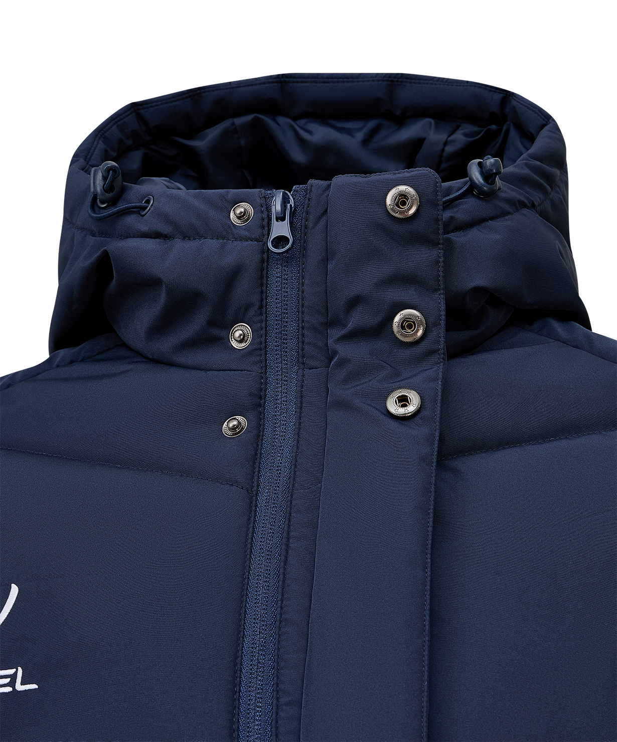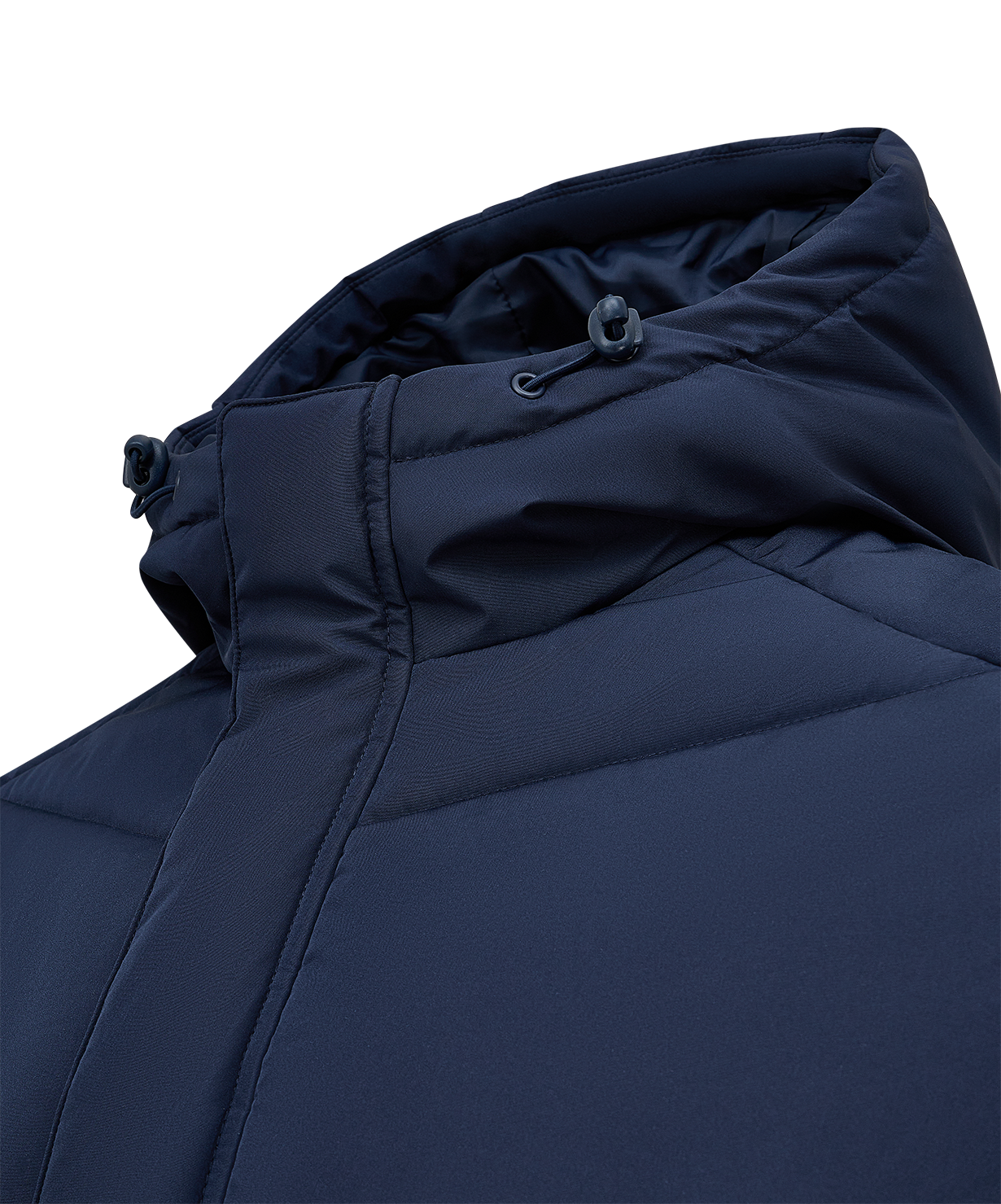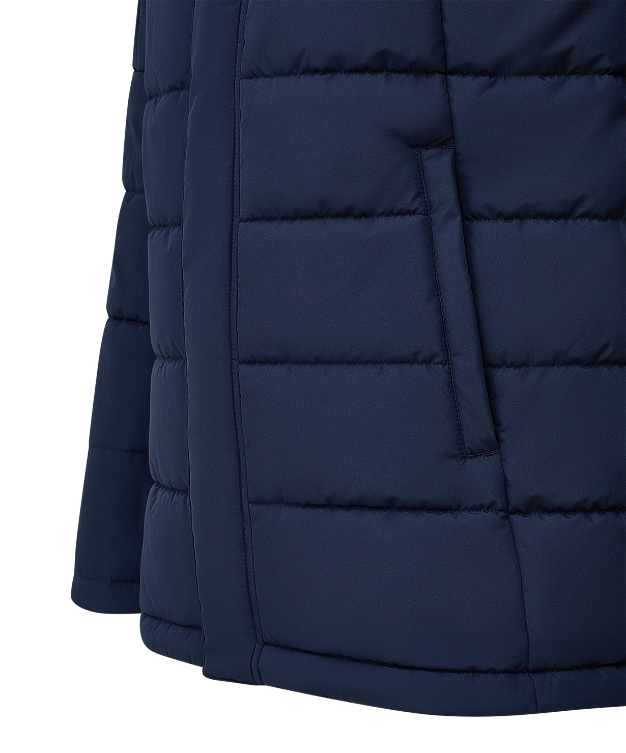 Куртка утепленная Jögel CAMP 2 PerFormPROOF Padded Jacket – удобная модель средней длины. Материал верха с влагоотталкивающей пропиткой Ball Effect имеет высокую плотность переплетения, что не только защищает от промокания, но и обеспечивает отличную износостойкость. Трехслойный синтетический утеплитель с разной плотностью (180 г на теле, 150 г на рукавах и 120 г на капюшоне) эффективно сохраняет тепло, при этом обладает малым весом и быстро отводит влагу. Модель дополнена функцией PerFormPROOF.\nPadded Jacket отлично подходит для носки при температуре до -15⁰ C (в зависимости от влажности и уровня активности), делая ее идеальным выбором для тренировок, прогулок или повседневного использования в прохладную погоду. Объемный капюшон с регулировкой и передняя молния с внешней ветрозащитной планкой на кнопках обеспечивают дополнительную защиту от ветра и холода. Боковые карманы на молниях и внутренний карман на молнии предлагают удобное хранение мелочей при активном образе жизни.\nPerFormPROOF - технология пропитки материалов Jögel, обеспечивающая спортсменам защиту от дождя и ветра во время плохих погодных условий.\nПреимущества:\nФункция PerFormPROOF;\nВодоотталкивающая пропитка Ball Effect;\nЭффективное сохранение тепла;\nДополнительная защита от ветра;\nКарманы на молнии.\nХарактеристики:\nСостав: основной материал: 100% полиэстер, подкладка: 100% полиэстер, утеплитель: 100% полиэстер\nРазмерный ряд: YS, YM, YL, XS, S, M, L, XL, XXL, XXXL\nЦвет: темно-синий\nВид упаковки: пакет с клапан скотчем, картонной этикеткой и стикером\nСтрана производства: Китай