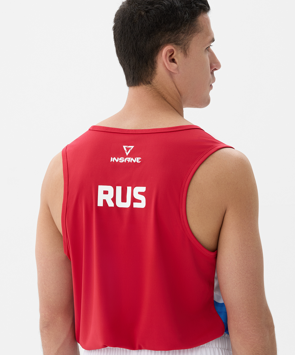 Боксерская майка INSANE RBF – экипировка, аккредитованная Федерацией бокса России и соответствующая правилам проведения соревнований любого уровня. Удобная и практичная форма предназначена для тренировок и выступлений на ринге.\nМодель изготовлена из износостойкого материала высокого качества, приятного к телу. Майка легкая и быстро сохнет.\nУдобный, свободный крой не мешает двигаться. Размерная сетка от S до XXL позволяет экипировать спортсменов разных возрастов. Мужская майка для бокса идеально сочетается с шортами INSANE RBF.\nПреимущества:\nФорма аккредитована Федерацией бокса России;\nДля соревнований любого уровня;\nПриятный к телу материал;\nСвободный крой;\nСтильный дизайн.