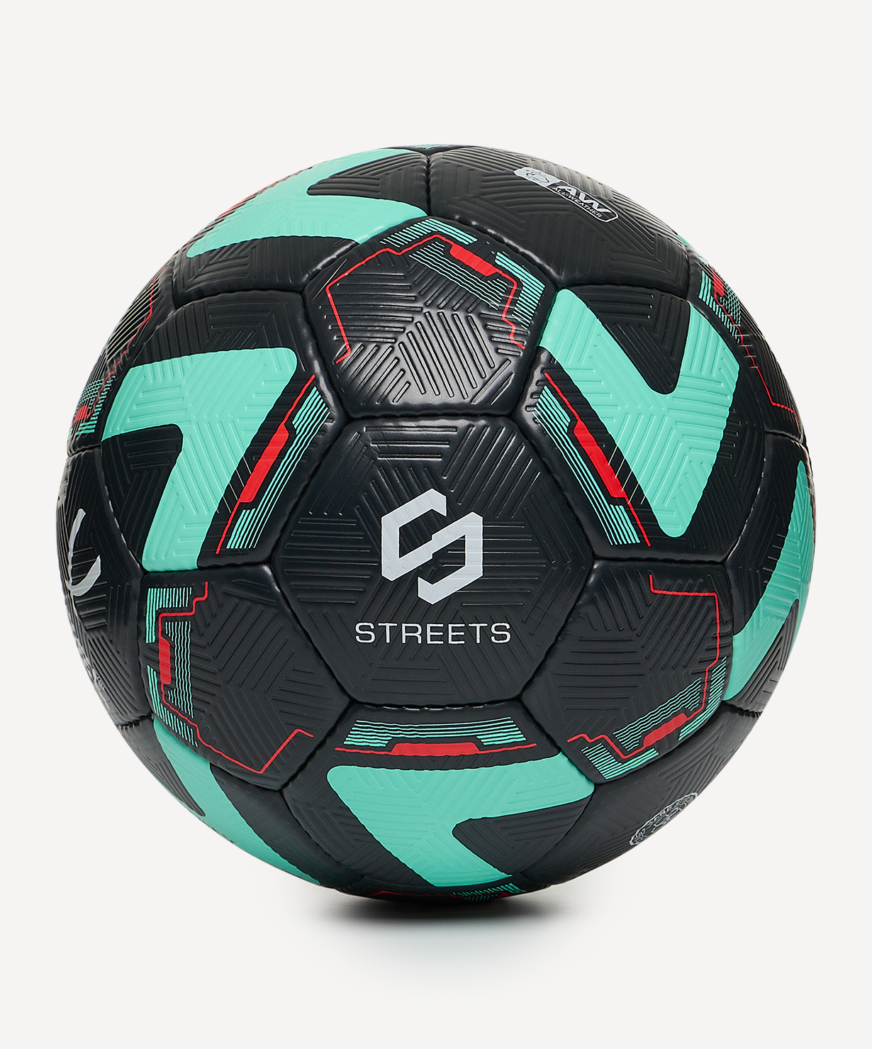 Категория: Тренировочный\nКоллекция: 2025/2027\nЛинейка: Streets\nОбновлённый дизайн первого футбольного мяча JÖGEL в линейке Streets. Красивое оформление дизайнерских элементов в мятном и красном цветах на чёрном фоне.\nTrinity выполнен по технологии ручной сшивки, придающей ему максимальную надежность. Повышенная износостойкость, обеспеченная материалом поверхности и специальным дизайном тиснения, позволяет играть мячом на самых жестких уличных покрытиях.\nМяч составлен в традиционной конструкции из 32 панелей и оснащен латексной камерой с бутиловым ниппелем для обеспечения продолжительного сохранения воздуха в камере. Поверхность выполнена из глянцевой текстурированной синтетической кожи (полиуретана). Модель имеет 4 подкладочных слоя на нетканой основе (смесь хлопка с полиэстером).\nДанный мяч рекомендован для любительской игры и тренировок любительских команд, подходит для любых возрастов.\nОфициальный размер и вес FIFA.\nВнимание: мяч поставляется в спущенном виде. Рекомендуем приобрести насос и иглу для накачивания.\nХарактеристики:\nРекомендованные покрытия: натуральный газон, синтетическая трава, резина, гаревые поля, паркет\nМатериал поверхности: синтетическая кожа (полиуретан) толщиной 1,5 мм\nМатериал камеры: латекс\nТип соединения панелей: ручная сшивка\nКоличество подкладочных слоев: 4\nКоличество панелей: 32\nРазмер: 5\nВес, гр.: 410-450\nДлина окружности, см: 68-70\nРекомендованное давление: 0.6-0.8 бар\nМяч поставляется: спущенный\nОсновной цвет: черный\nДополнительный цвет: мятный, красный\nПроизводство: Пакистан