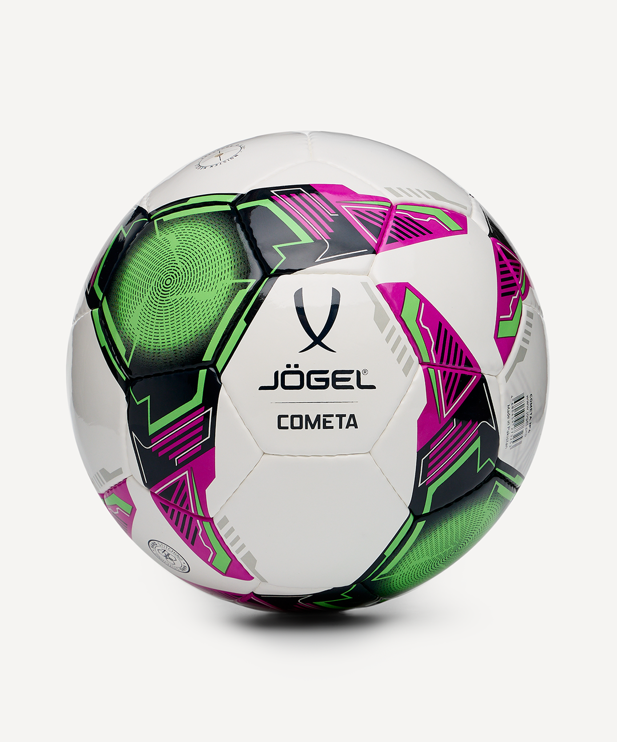 Категория: Профессиональный\nКоллекция: 2025/2026\nЛинейка: Pro\nМяч Cometa от Jögel прекрасно подходит для тренировок и соревнований профессионального уровня. Красочная модель с необычным сочетанием розового и зелёного цветов изготовлена по технологии ручной сшивки, что позволяет давлению внутри снаряда распределяться равномерно, обеспечивая его надежность и упругость. Поверхность мяча выполнена из синтетической кожи (полиуретана) толщиной 1,5 мм, что придает изделию повышенную износостойкость. Особенностью являются 4 подкладочных слоя: 2 слоя из хлопка и 2 слоя вискозы. Такая конструкция обеспечивают дополнительную прочность модели, сохраняя при этом форму и вес мяча и улучшая его игровые характеристики. Cometa оснащена высококлассной камерой с наполнителем, что способствует низкому отскоку мяча по стандартам FIFA.\nВнимание: мяч поставляется в спущенном виде. Рекомендуем приобрести насос и иглу для накачивания.\nХарактеристики:\nРекомендованные покрытия: паркет, уличные площадки с твердыми ровными покрытиями\nМатериал поверхности: 1.5 мм синтетическая кожа (полиуретан) + 4 подкладочных слоя (2 слоя хлопка и 2 слоя вискозы)\nМатериал камеры: бутил\nТип соединения панелей: ручная сшивка\nКоличество подкладочных слоев: 4\nКоличество панелей: 32\nРазмер: 4\nВес, г: 400-440\nДлина окружности, см: 62-64\nРекомендованное давление: 0.6-0.8 bar\nМяч поставляется: спущенный\nОсновной цвет: белый\nДополнительный цвет: розовый, зеленый\nПроизводство: Пакистан