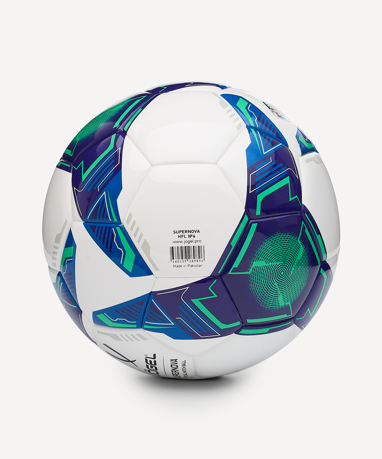 Категория: Матчевый\nКоллекция: 2025/2026\nSupernova HFL – профессиональный мяч для футзала, разработанный специально для Высшей лиги футзала среди мужчин. Холодные цветовая палитра сине-зелёных оттенков в дизайне отражает ожидание захватывающих, зрелищных матчей. Мяч соответствует всем требованиям FIFA и подходит для соревнований самого высокого уровня. Данная модель обладает отличными игровыми характеристиками и оптимальна как для тренировок, так и для официальных игр команд. Supernova HFL выполнен по технологии термосклеивания THB Technology, благодаря чему обладает идеально круглой формой, герметичен и не пропускает влагу внутрь, а давление в мяче распределяется равномерно. Поверхность сделана из высококачественной синтетической кожи (полиуретана), слой толщиной 1,0 мм отличается повышенной износостойкостью. Подкладочный слой выполнен из специальной пены толщиной 4,0 мм, которая позволяет с комфортом использовать мяч в игровых ситуациях. Снаряд оснащен высококлассной камерой с наполнителем, которая обеспечивает низкий отскок по стандартам FIFA.\nВнимание: Данный мяч поставляется с завода-изготовителя в накаченном состоянии для безопасной транспортировки и хранения. Не рекомендуется полностью спускать данные мячи, чтобы не нарушить целостность панелей. Рекомендуем приобрести насос и иглу для накачки мяча.\nХарактеристики:\nРекомендованные покрытия: паркет, уличные площадки с твердыми ровными покрытиями\nМатериал поверхности: 1.0 мм синтетическая кожа (полиуретан) + 4.0 мм подкладочный слой из пены\nМатериал камеры: бутил\nТип соединения панелей: термосшивка\nКоличество подкладочных слоев: 1\nКоличество панелей: 32\nРазмер: 4\nВес, г: 400-440\nДлина окружности, см: 62-64\nРекомендованное давление: 0.6-0.8 bar\nМяч поставляется: накаченный\nОсновной цвет: белый\nДополнительный цвет: синий/зеленый\nПроизводство: Пакистан
