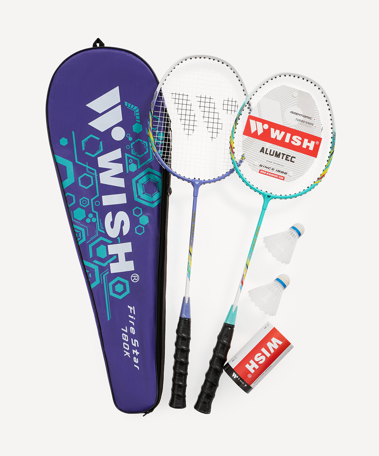 Набор ракеток для бадминтона WISH состоит из двух ракеток изометрической формы, двух пластиковых воланов и чехла из ПВХ для переноски и хранения.\nЭтот яркий и стильный набор был разработан для бадминтонистов-любителей, которым требуется максимально простая в игре и маневренная ракетка с современной технологией виброгашения. Виброгаситель, расположенный в основании рукояти, снижает нагрузку на суставы, делая ваши тренировки не только интересными, но и безопасными. Широкая алюминиевая рама обеспечивает уверенную и комфортную игру, а оптимальное для начинающих игроков натяжение струн позволяет выполнять сильные удары без лишних усилий.\nВ комплекте к ракеткам для бадминтона идет полноразмерный чехол с логотипом бренда.\nПреимущества:\nДолгий срок службы благодаря широкому ободу;\nБезопасность суставов, обеспечиваемая современным виброгасителем;\nВсе необходимое для игры в одном комплекте;\nОптимальное решение для новичков и любителей.