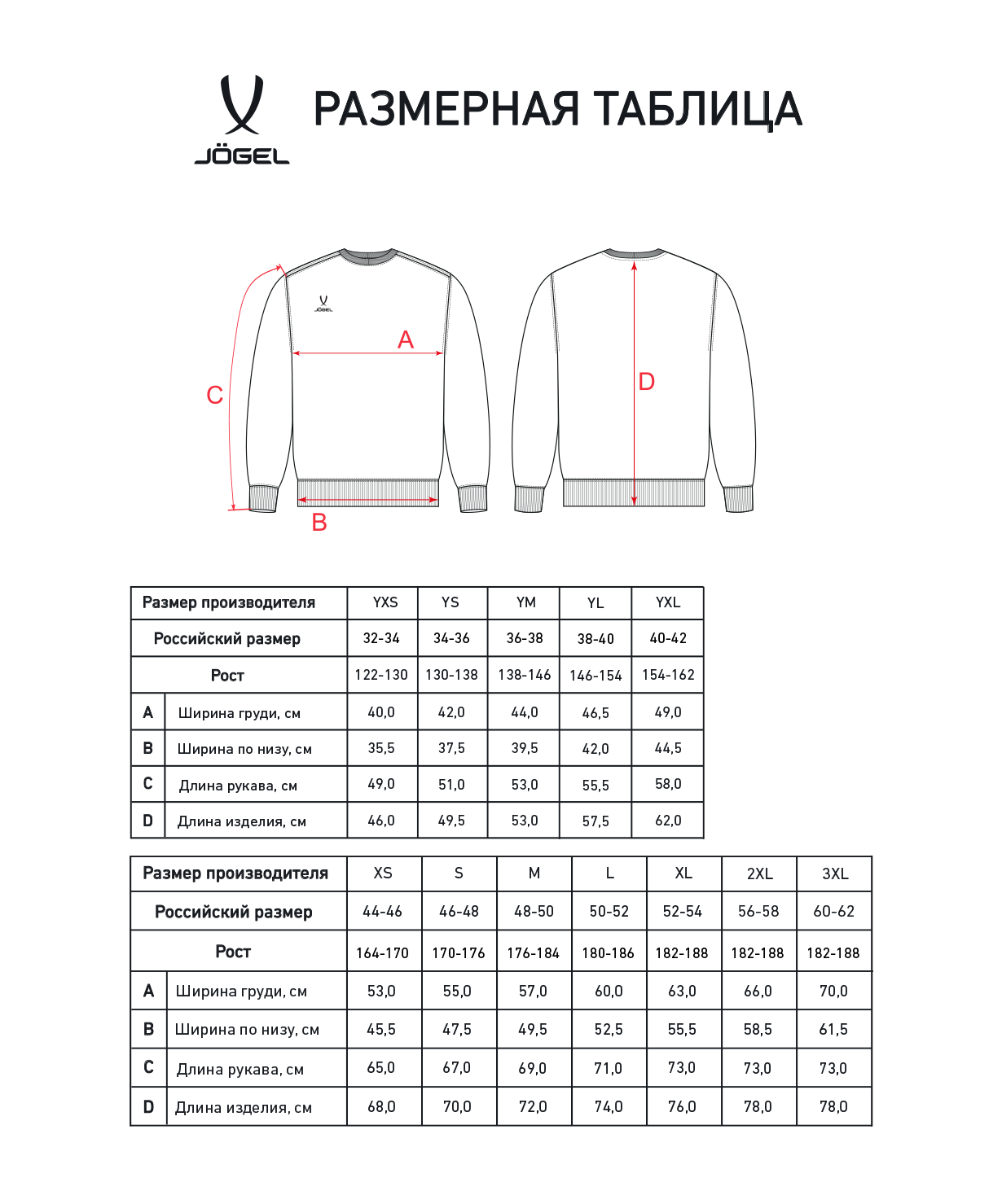 Свитшот JÖGEL ESSENTIAL Sweatshirt – удобная одежда, которая идеально подходит для повседневной носки. Базовая модель из износоустойчивой ткани отлично держит форму, не деформируется после стирок и не линяет. Оптимальное сочетание хлопка и полиэстера в составе обеспечивает необходимую мягкость и низкую сминаемость. Мягкие манжеты и пояс из рибаны прилегают к телу, защищая от холода и ветра. Дополнительный комфорт придает петельчатая изнанка.\nАктуальный минималистичный дизайн впишется в любой гардероб и отлично сочетается со спортивной экипировкой JÖGEL.\nПреимущества:\nБазовая модель для повседневной носки;\nИзносоустойчивая ткань;\nПетельчатая изнанка, приятная на ощупь;\nМанжеты и пояс из рибаны;\nЛаконичный дизайн.\nХарактеристики:\nСостав: 70% хлопок, 30% полиэстер\nЦвет: темно-синий\nРазмер: XS, S, M, L, XL, XXL, XXXL\nТип упаковки: пакет зип-лок\nПроизводство: Китай